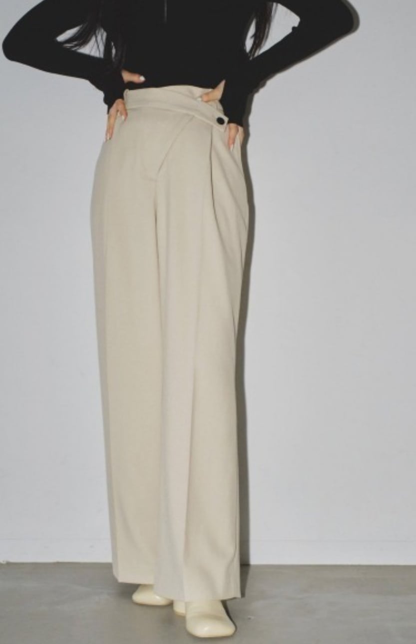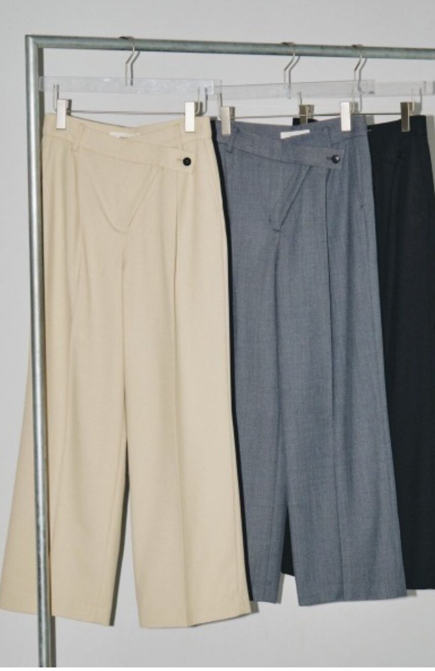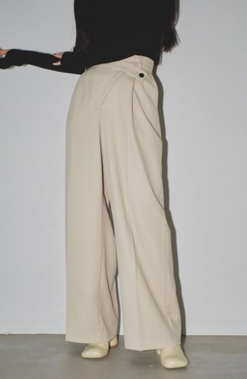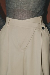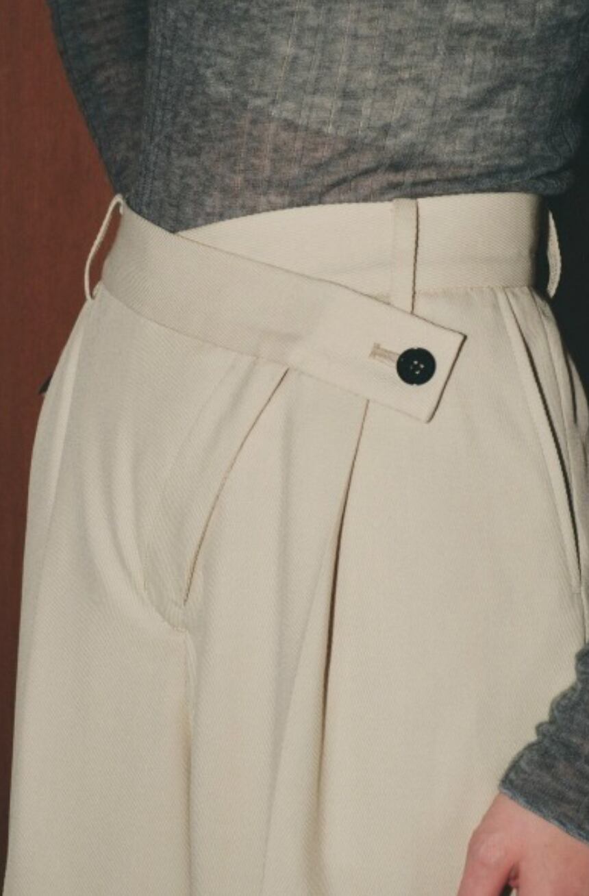 マニッシュな雰囲気に仕立てた深めのタックと斜めのフロントデザインが魅力。