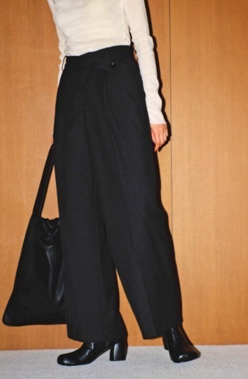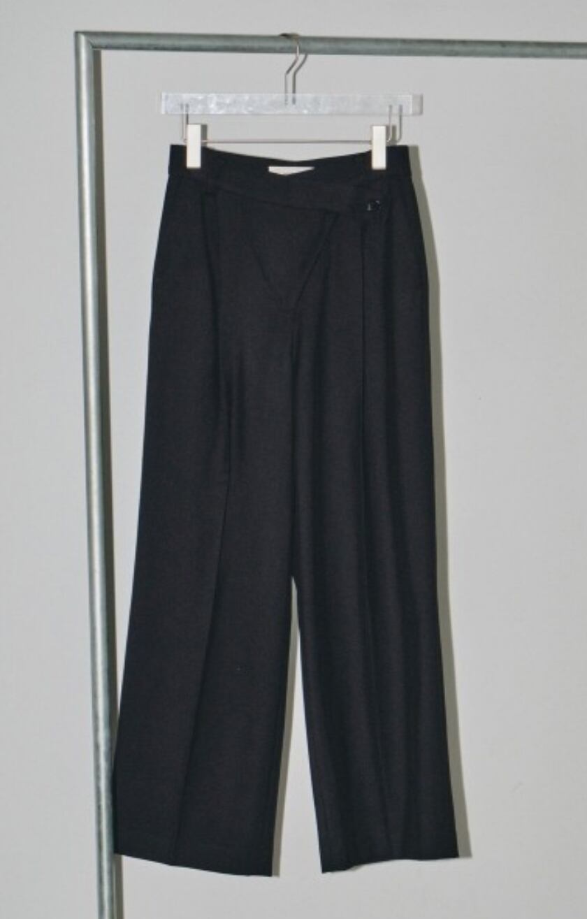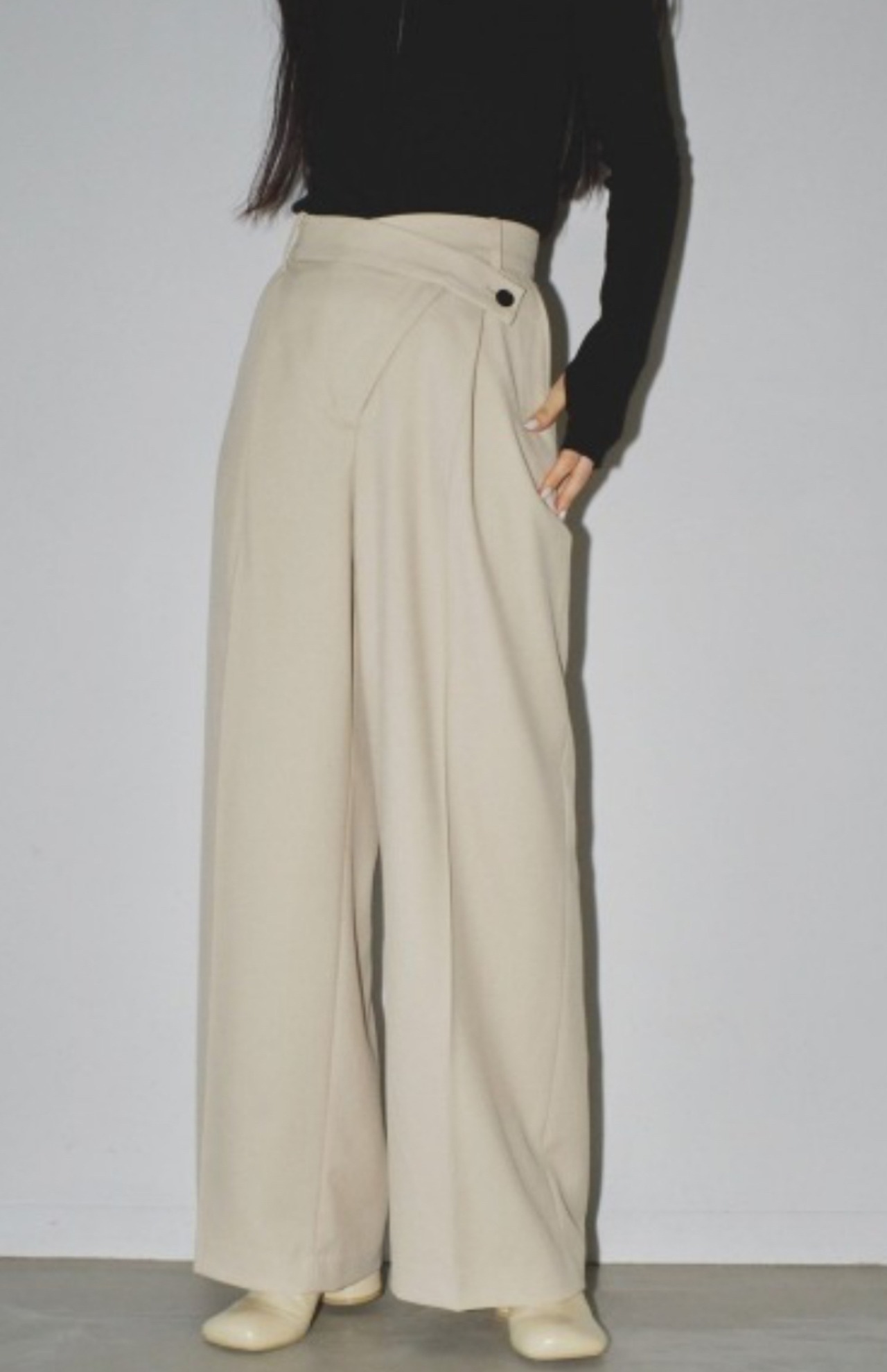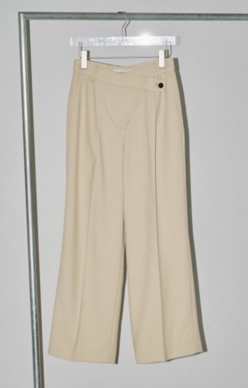 マニッシュな雰囲気に仕立てた深めのタックと斜めのフロントデザインが魅力。
