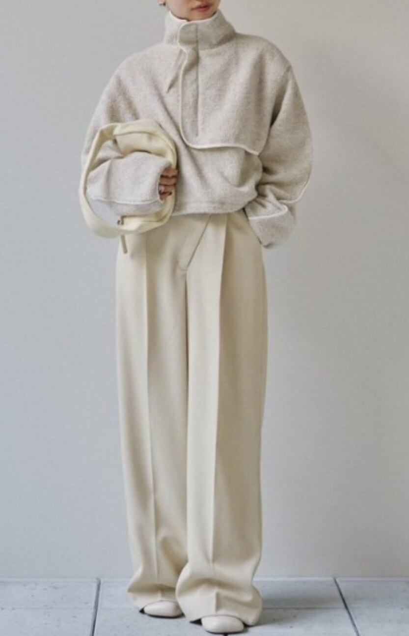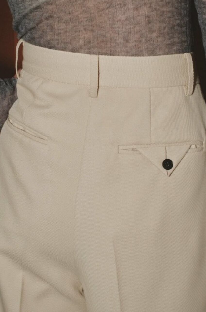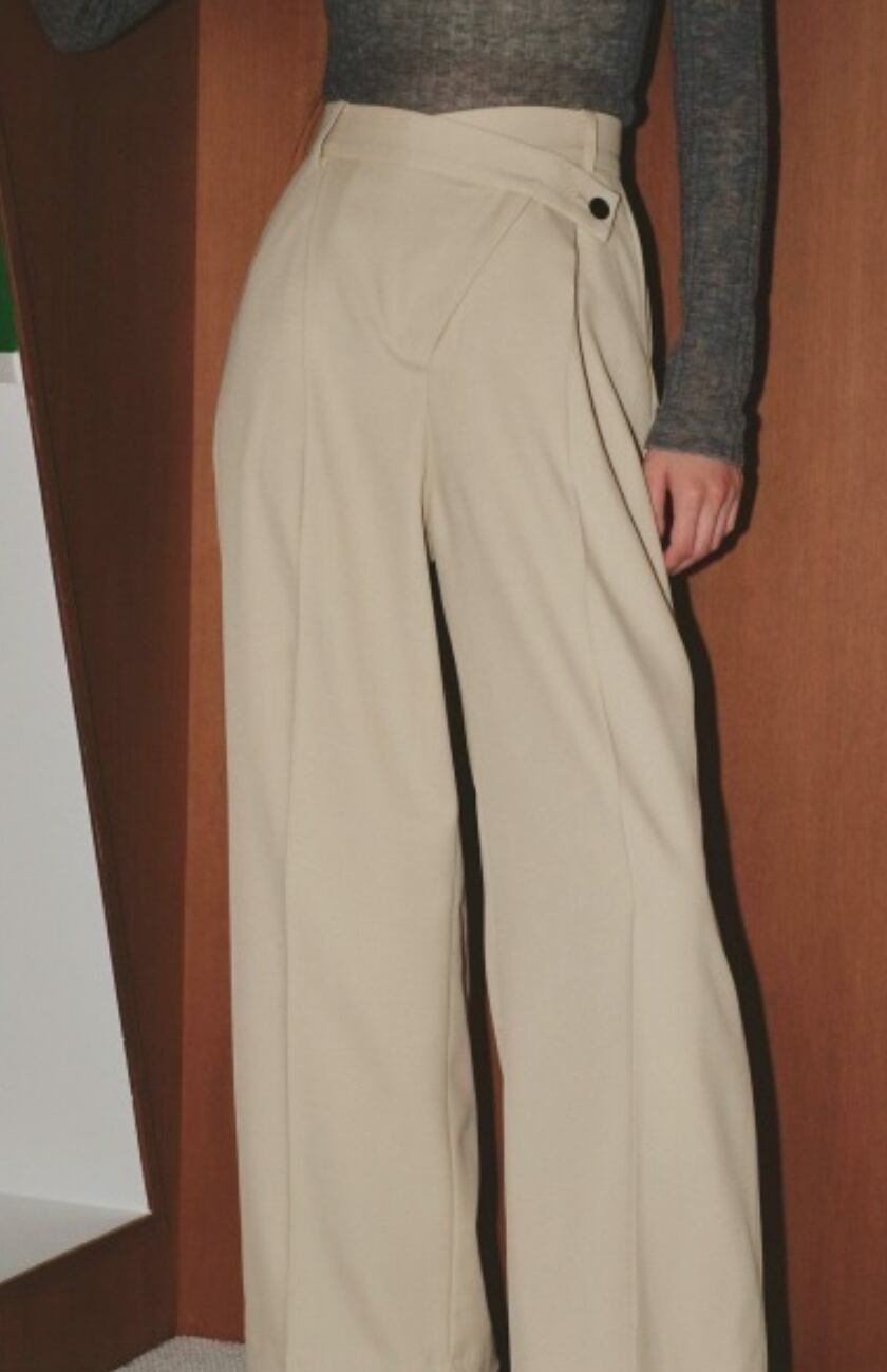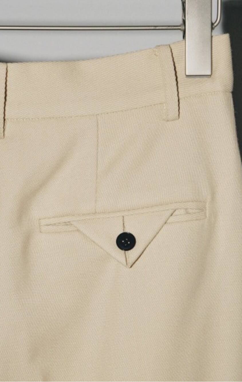 マニッシュな雰囲気に仕立てた深めのタックと斜めのフロントデザインが魅力。