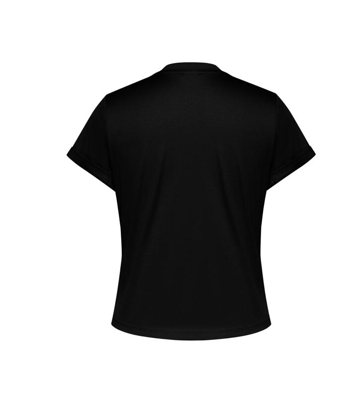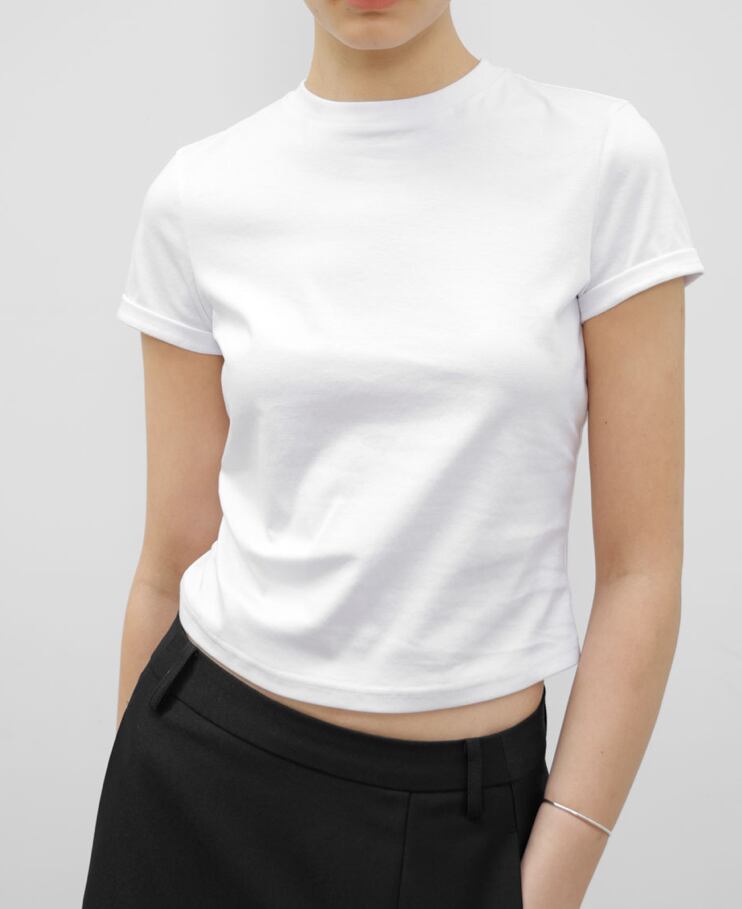襟元は首に密着しすぎず、細いネックラインがモードな雰囲気に。