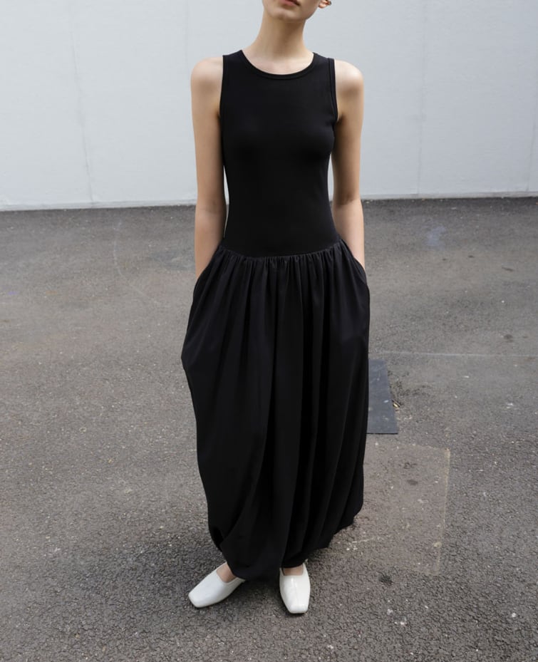 変則的なドレープと立体的なバルーンシルエットを表現しています。