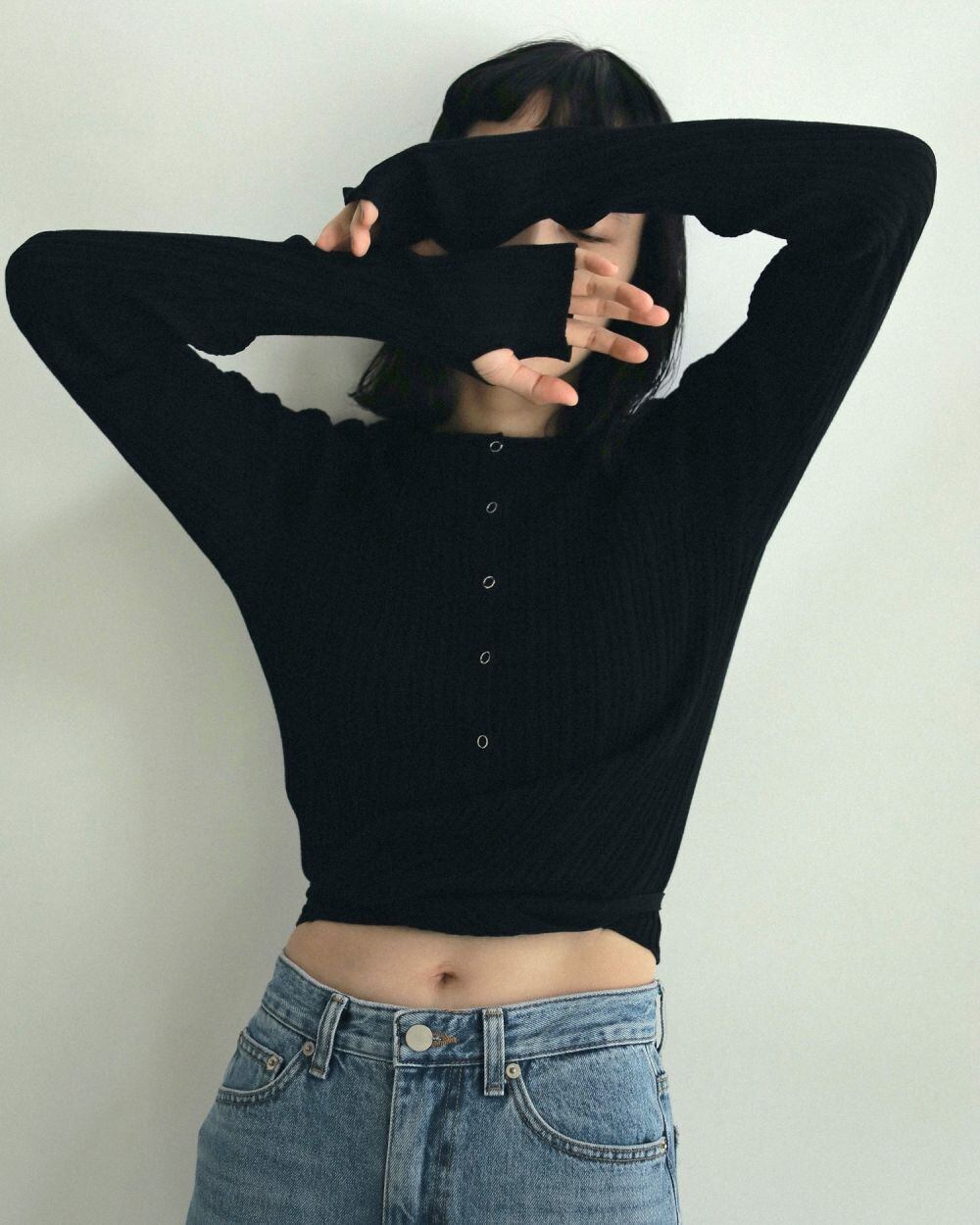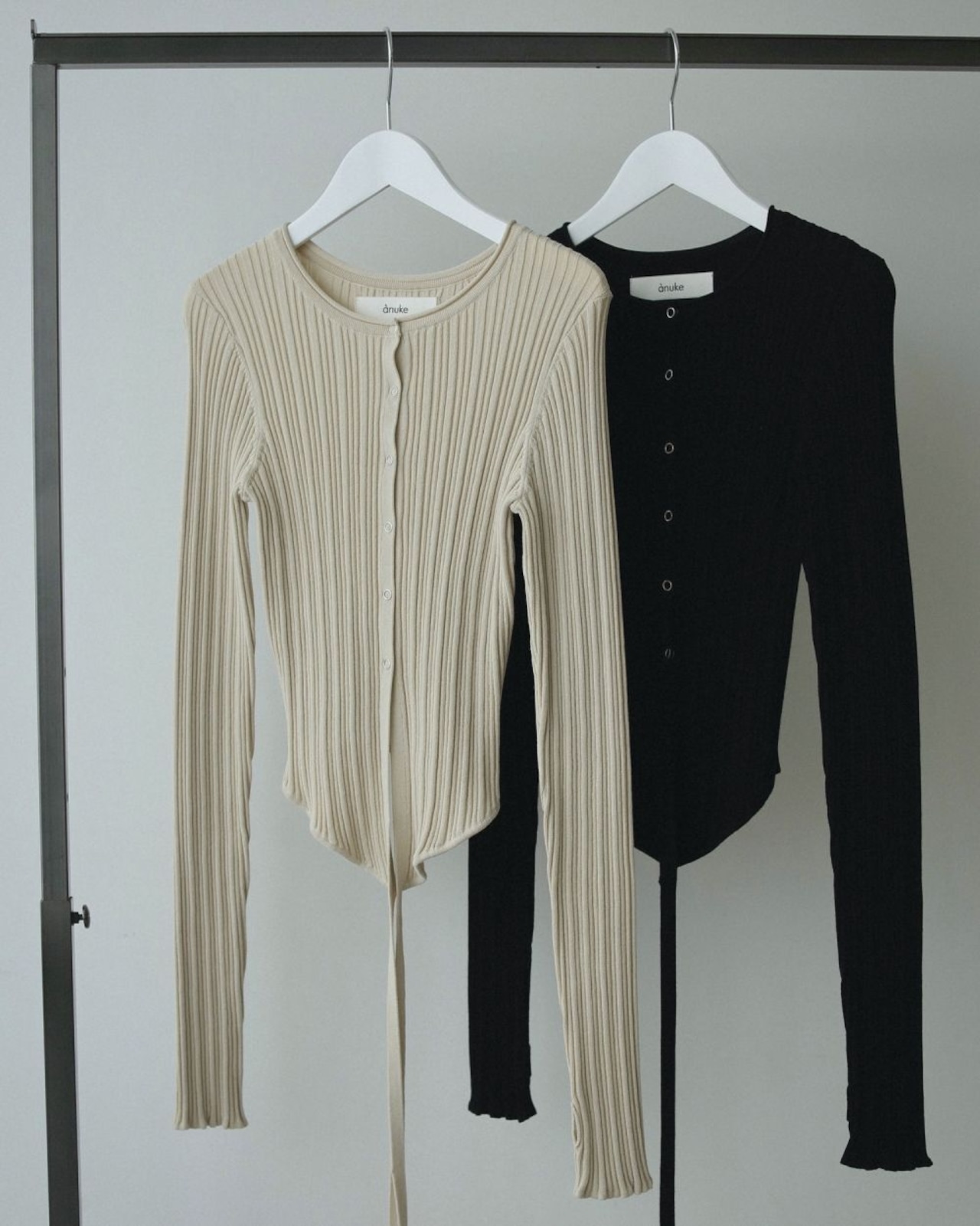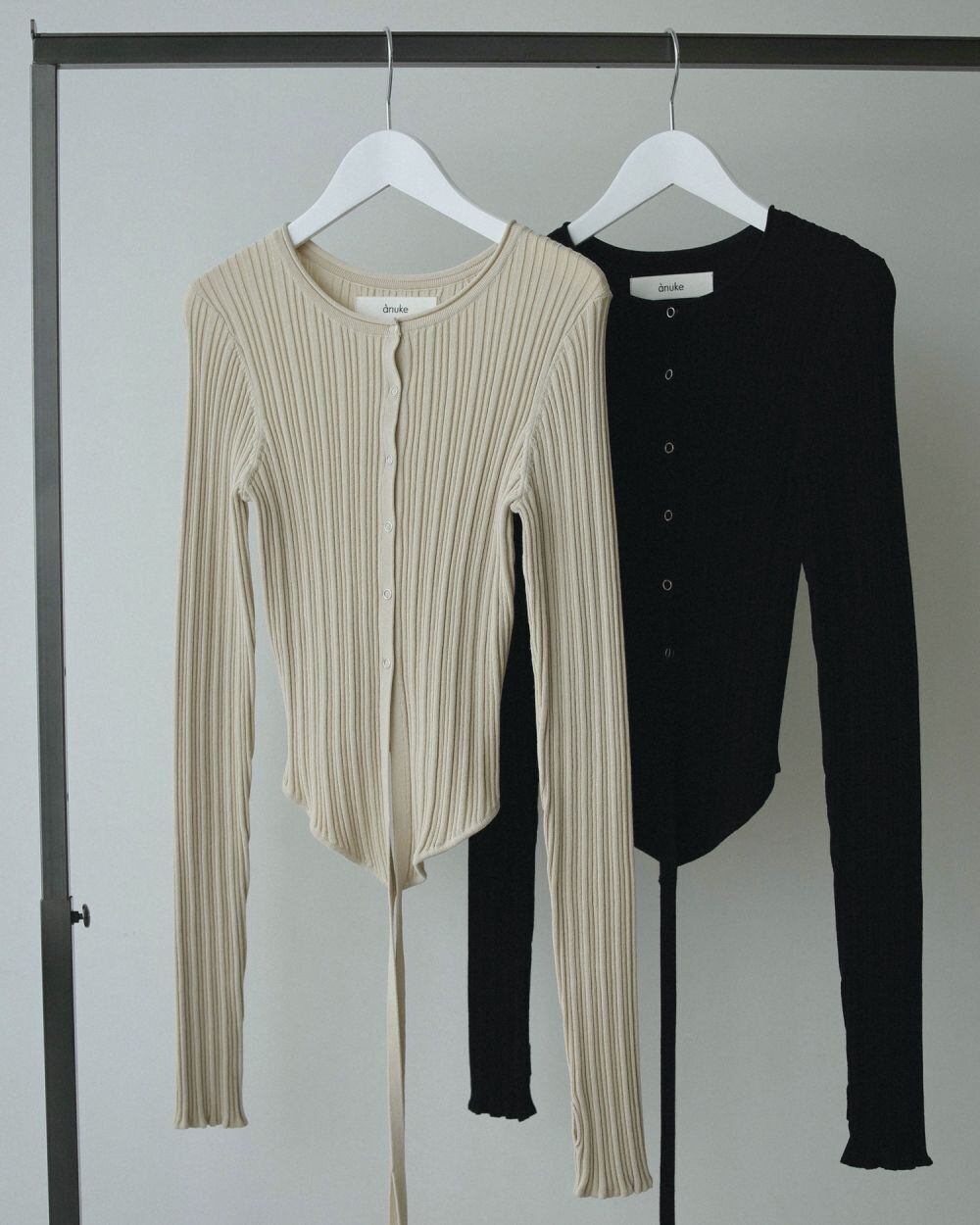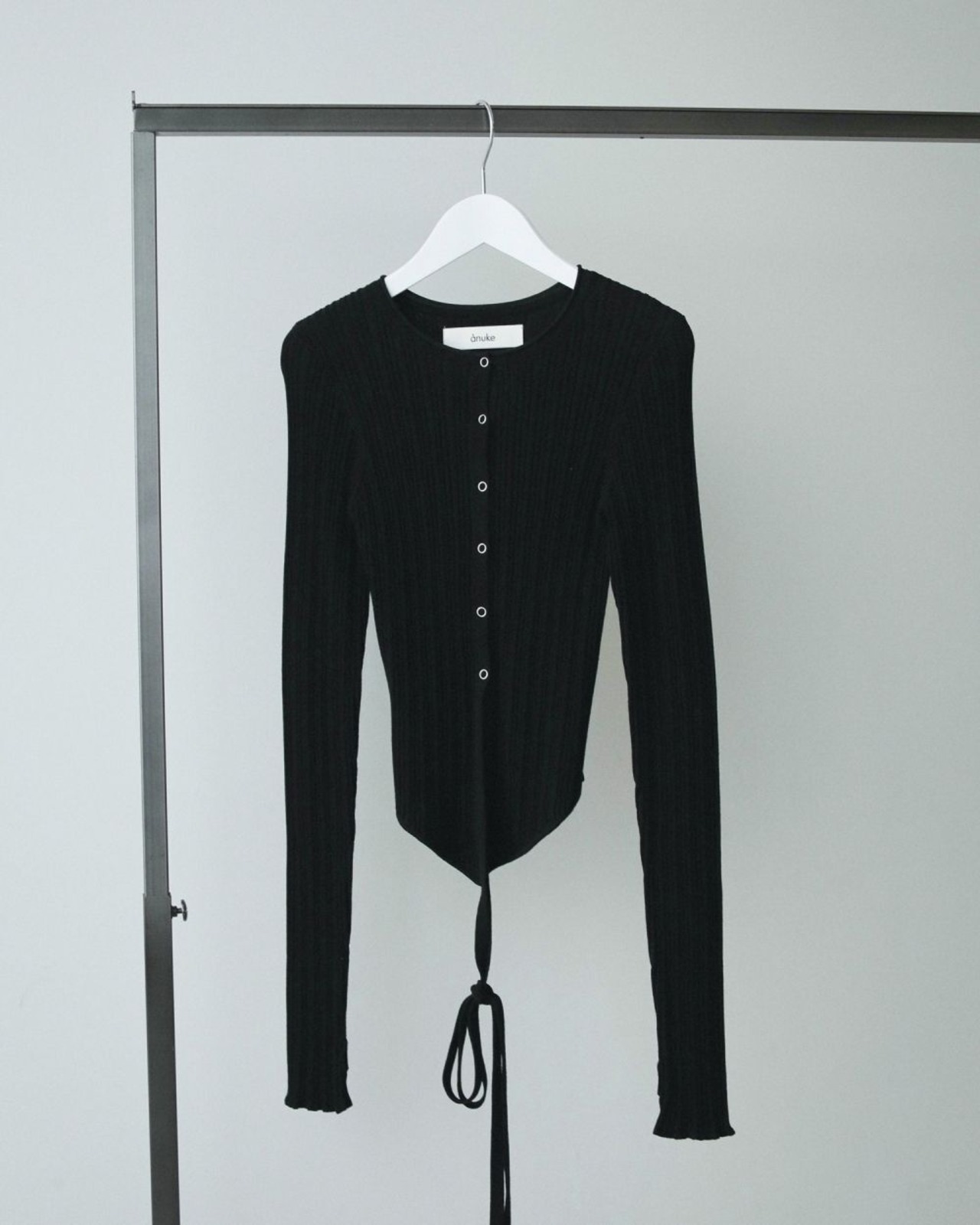 紐をぐるっと巻きつけてバックで結ぶタイプのニットカーディガン。フロントはドットボタンでさりげなくポイントに。ハイウエストのボトムスと合わせるのがおすすめです。