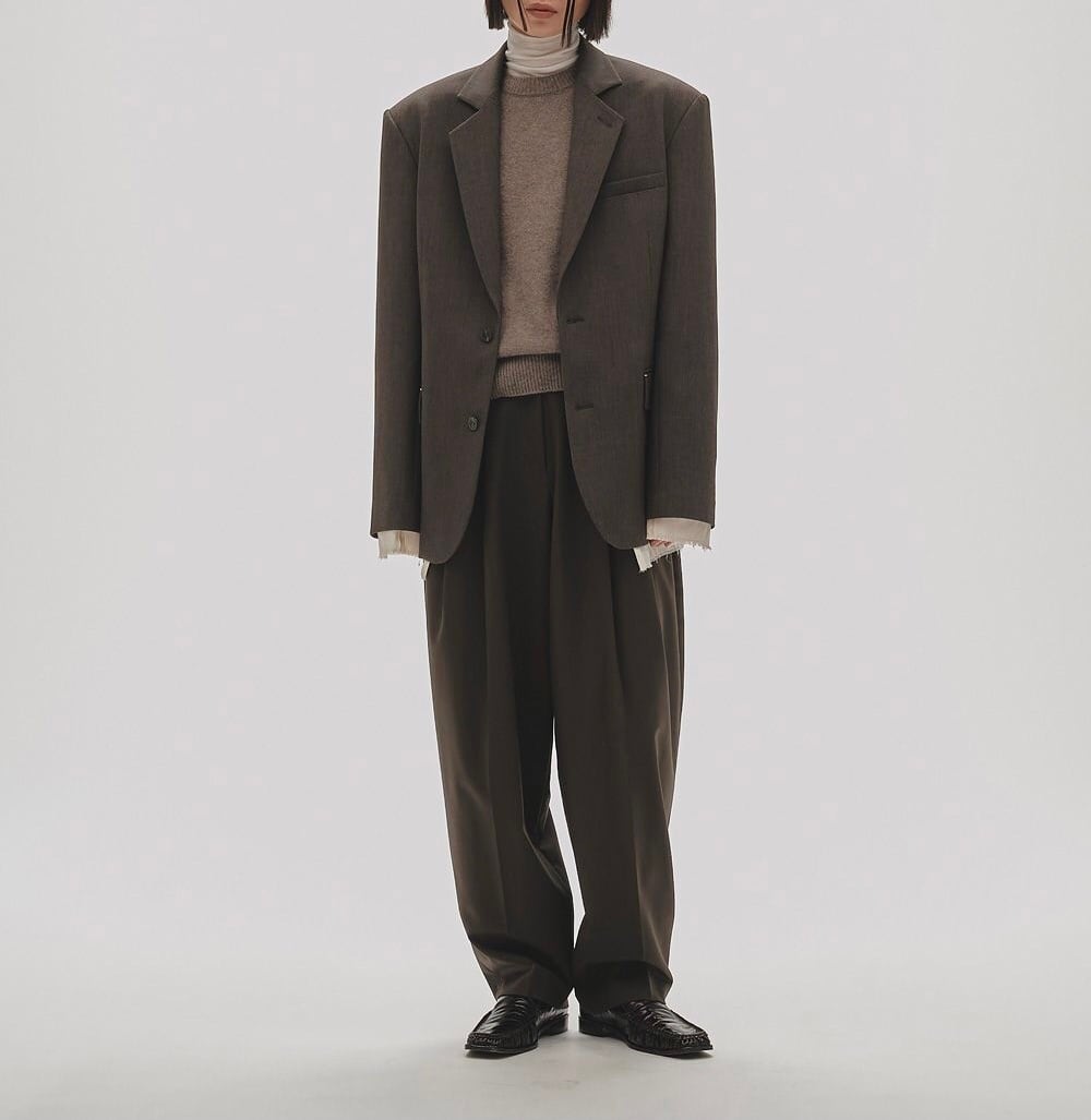 杢調で上品な質感の生地を使用したジャケット。厚みのある肩パッドで、オーバーシルエットなデザインがマニッシュ。裾や袖口からのぞく、カットオフ仕様の裏地が目をひく一枚です。