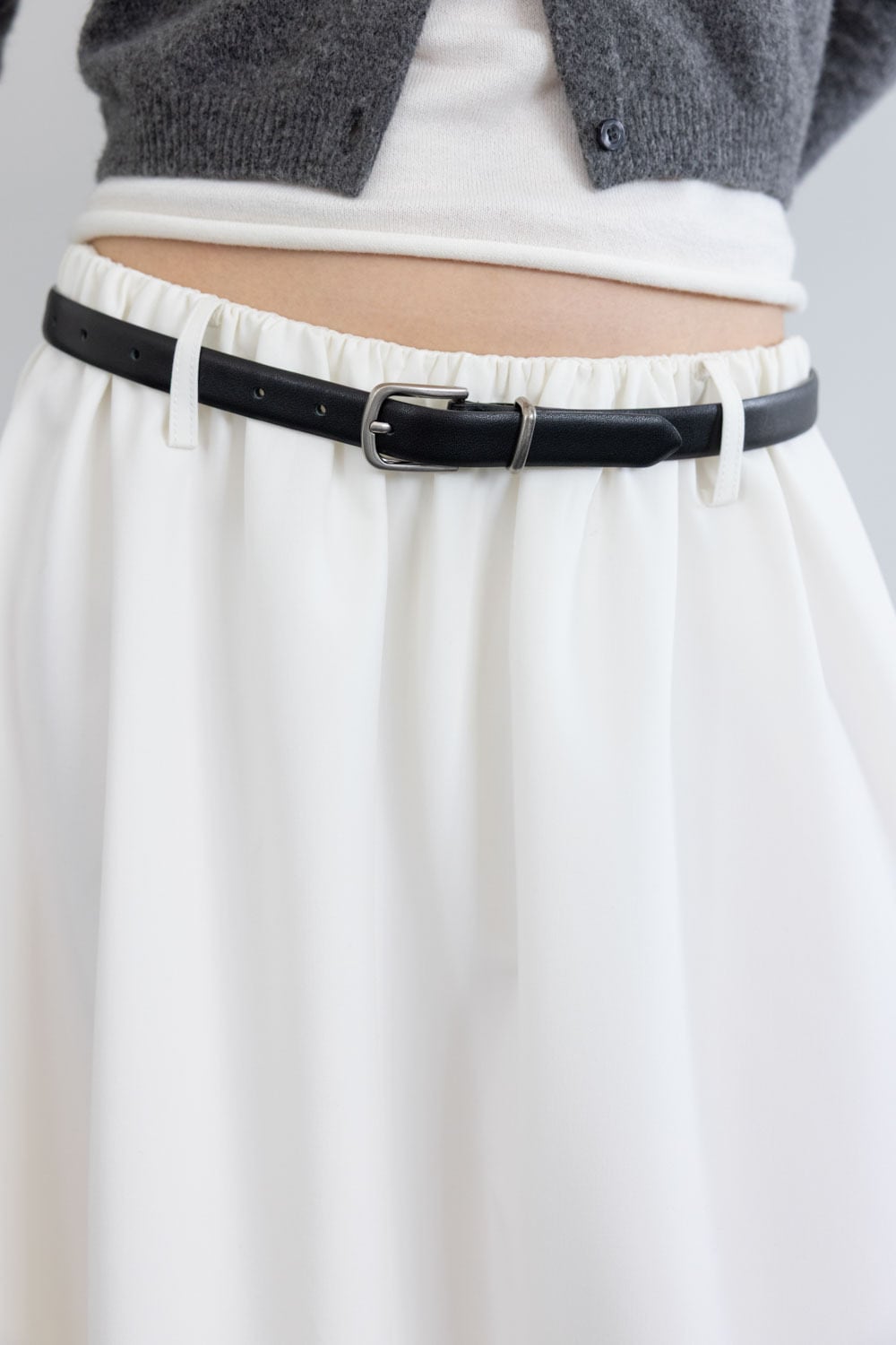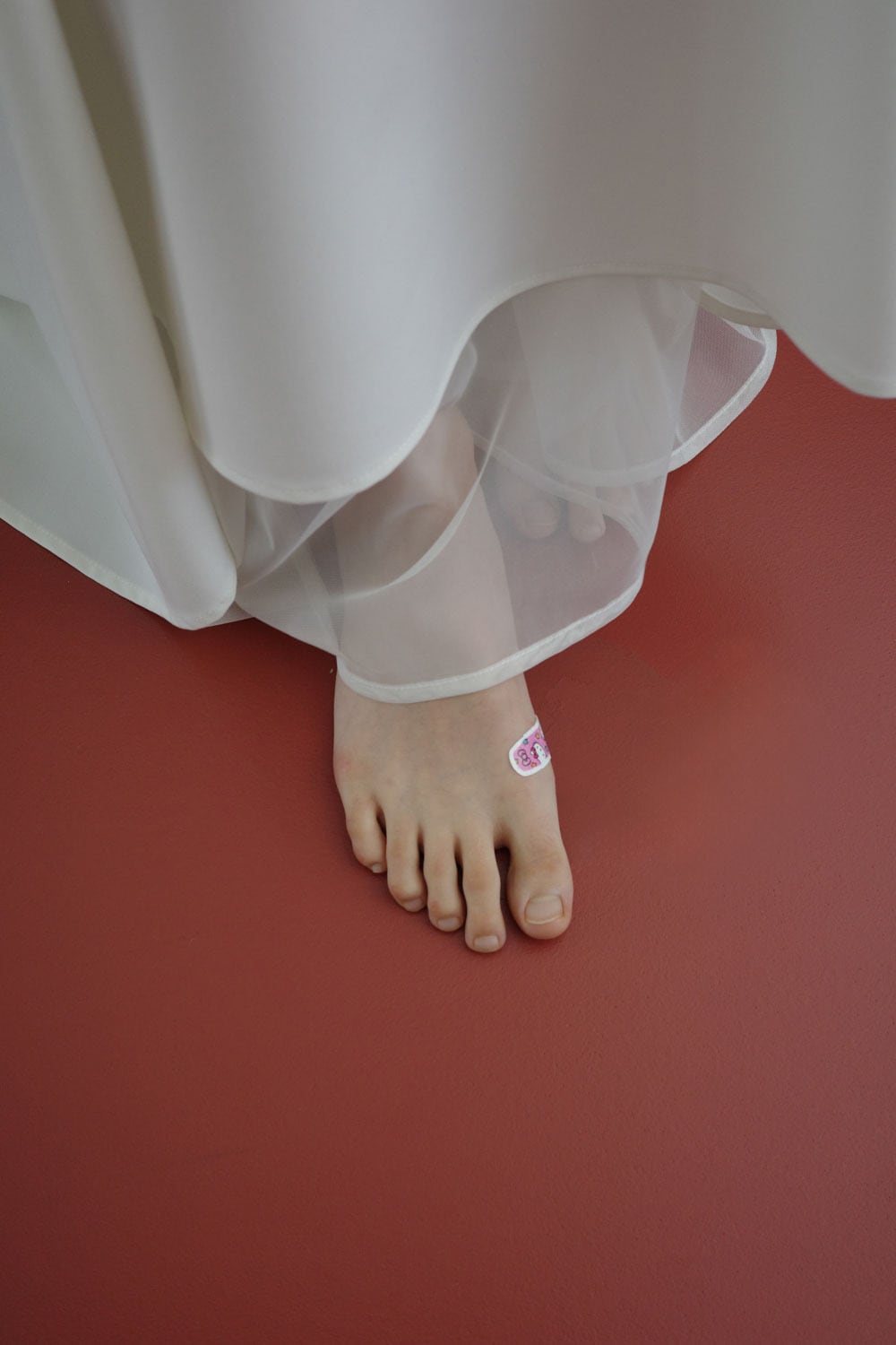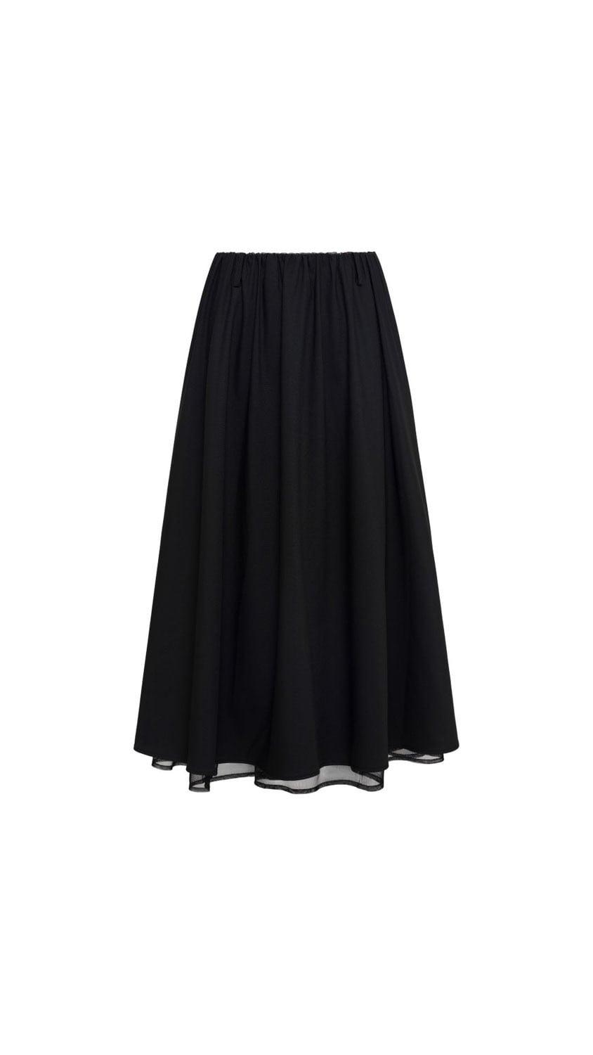 透けない素材はしわに強いスーツ生地で作られ、裾は内側のチュールスカートと着丈を変えることにより段差が出るようになっています