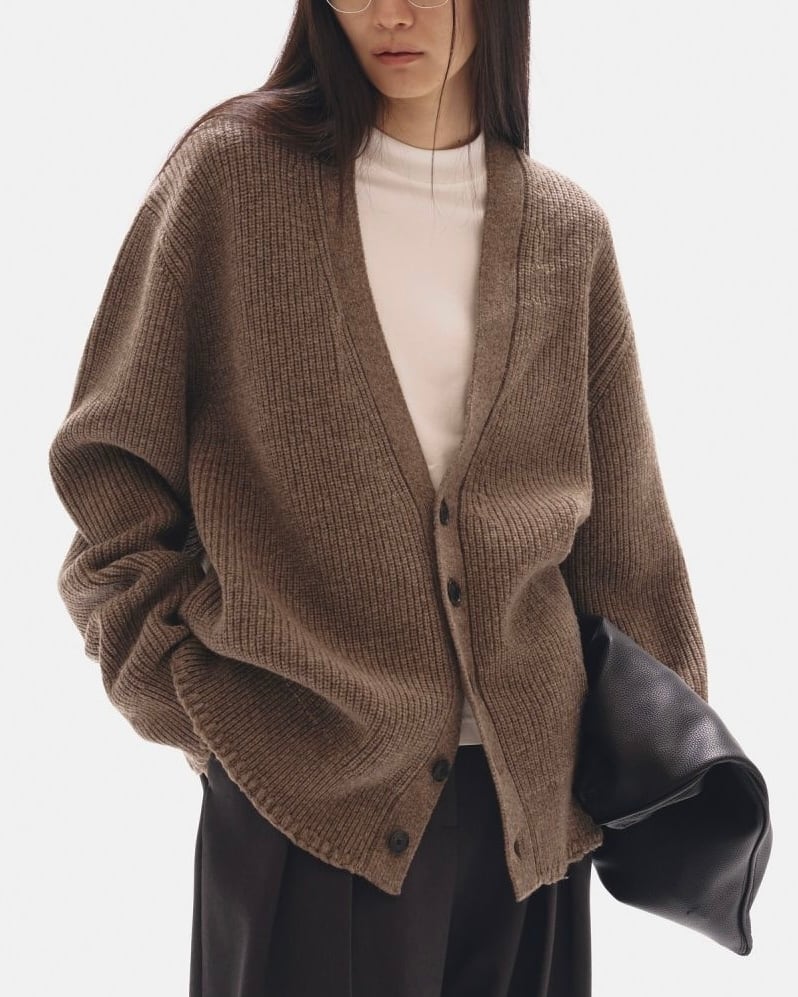 ラムウール混の糸で編み上げたリブニットカーディガン。