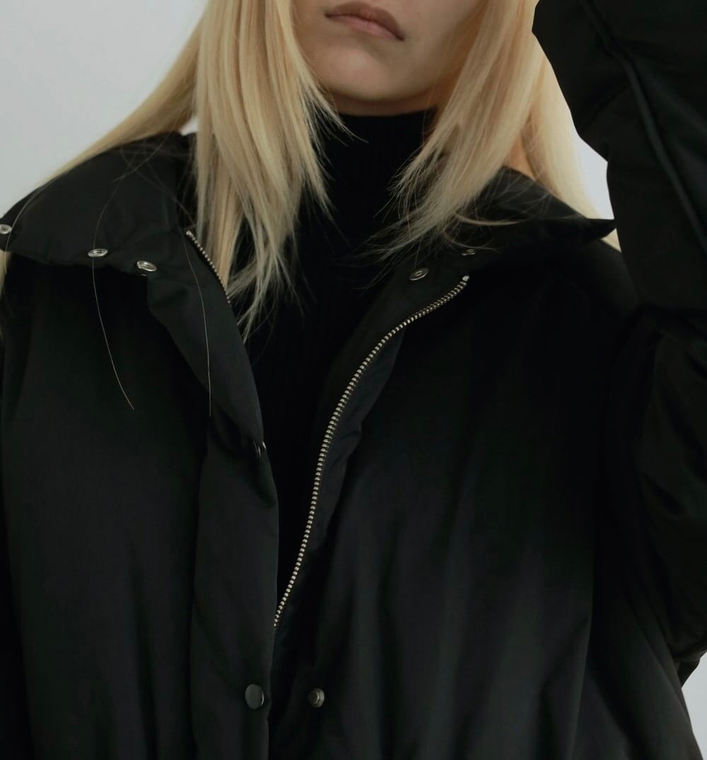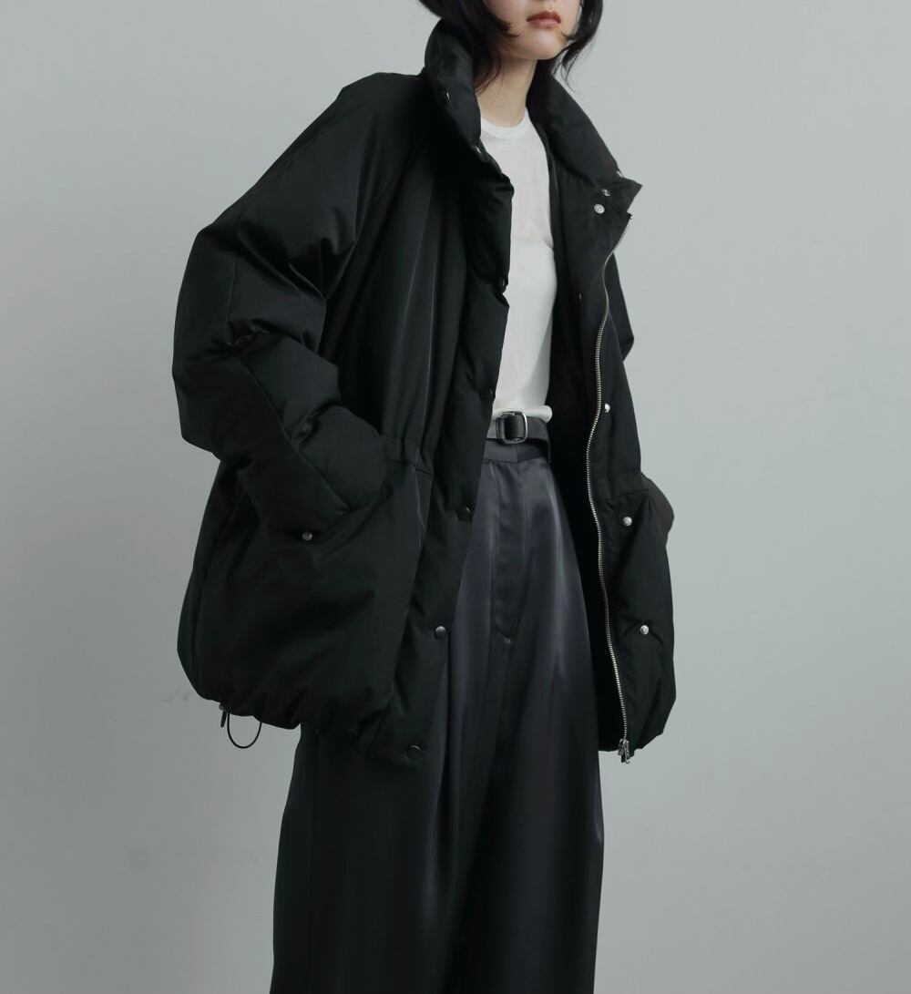 しなやかでマットな質感が上品見えする綾織素材で仕上げたスタンドカラーのダウンコート。腰回りがしっかりと隠れるミドル丈で、幅広いボトムと合わせやすく、ウエストや裾のドロストでシルエットをアレンジしていただけます。袖下と脇線に共布のパイピングを挟み込んでいるのもポイント。