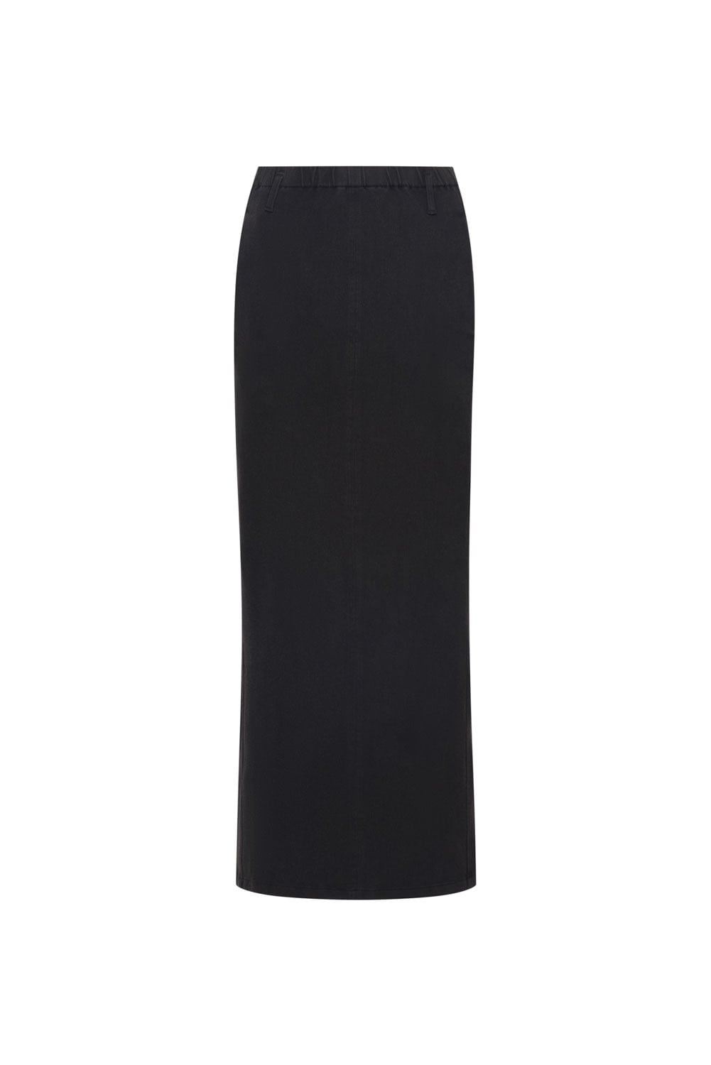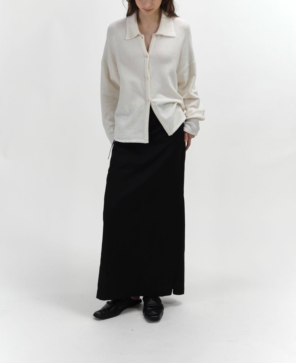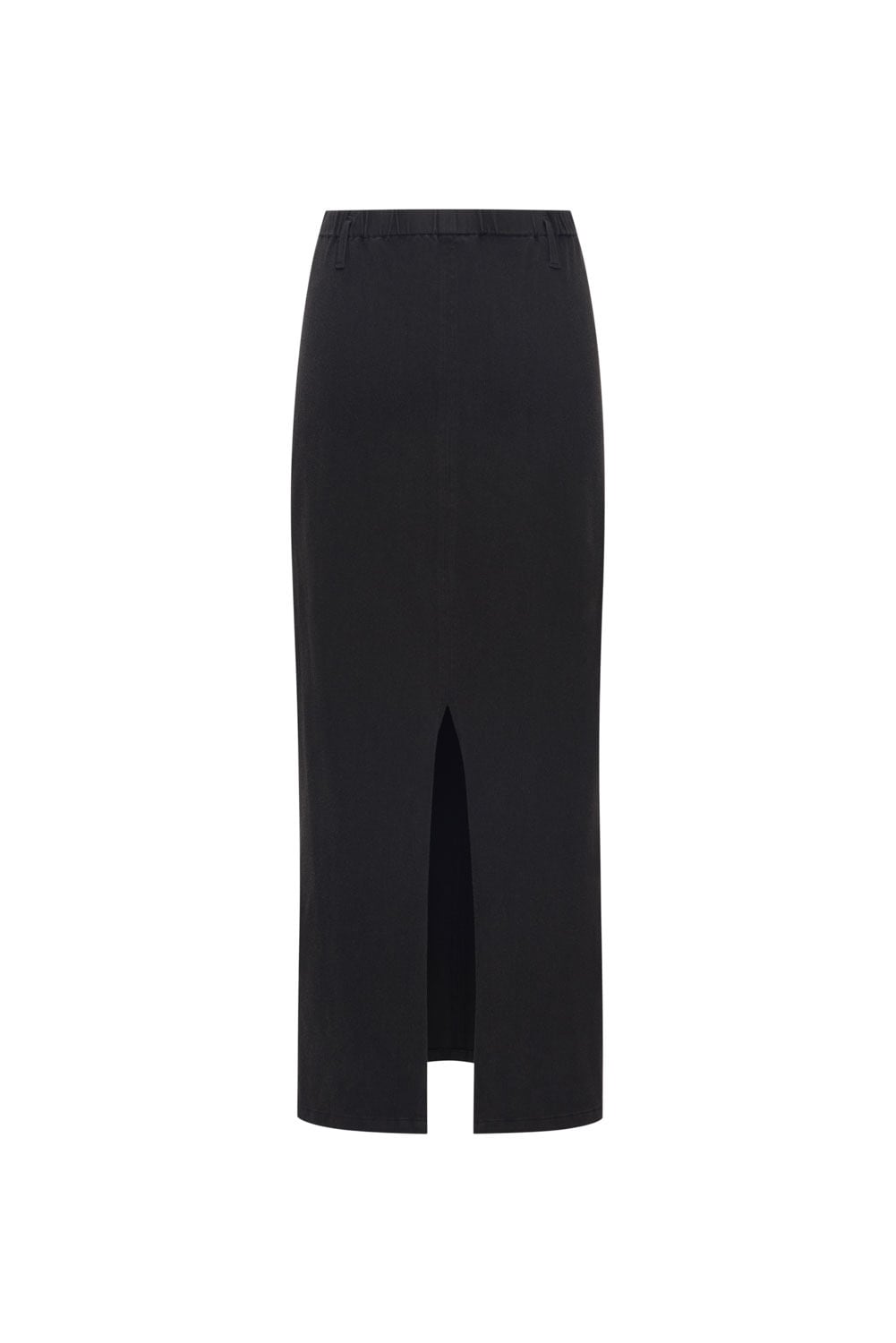 ・足首丈のスカート、背面の裾にスリットデザインあり。