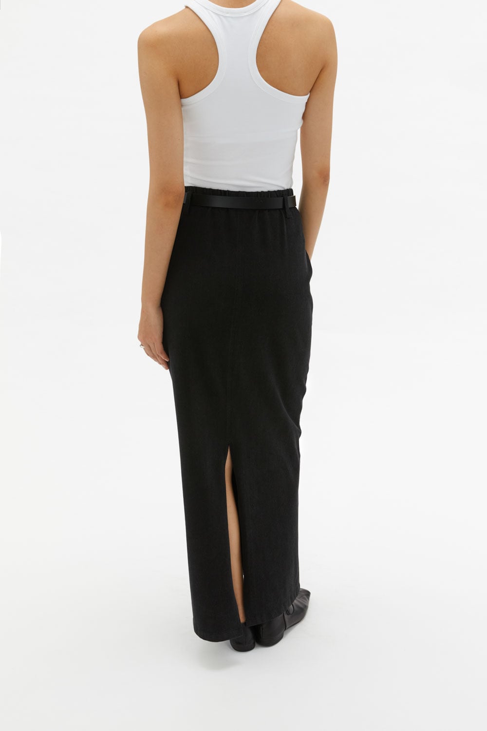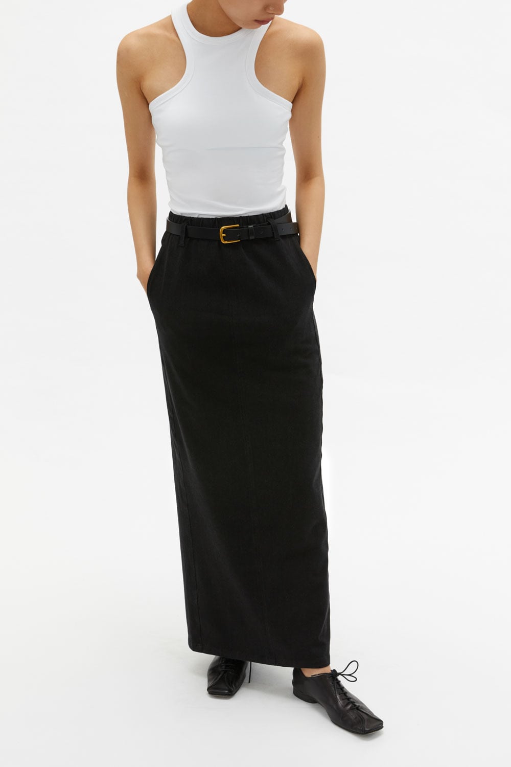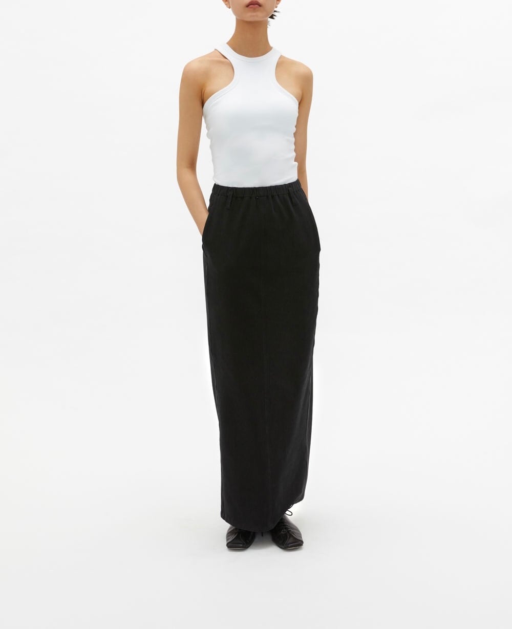 ・足首丈のスカート、背面の裾にスリットデザインあり。