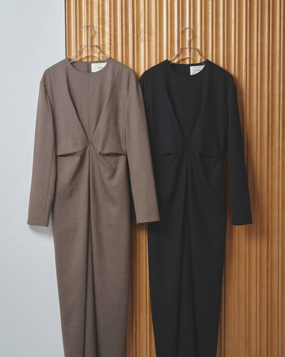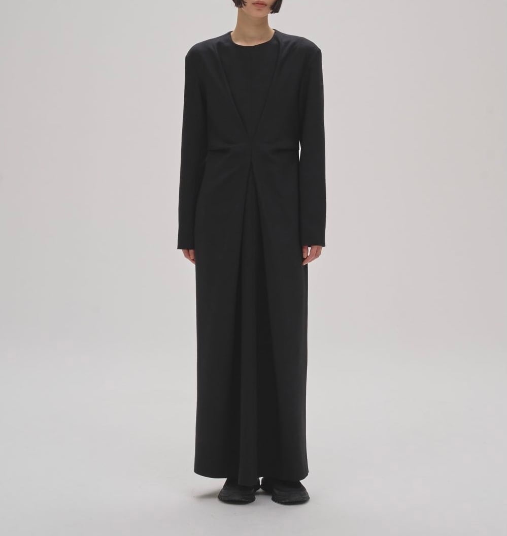 ウール混の二重織生地を使用したドレス。ウエストに寄せたタックが自然な立体感をつくり、体のラインを綺麗に見せてくれます。ステッチを極力抑えたミニマルなデザインで、合わせる小物でデイリーからオケージョンまで幅広く活躍する一枚です。
