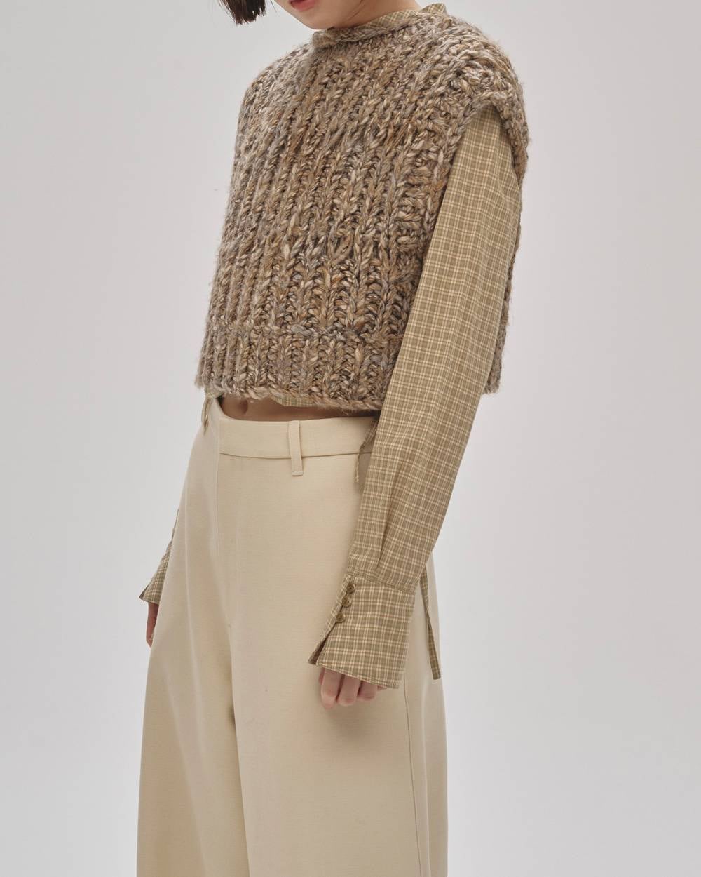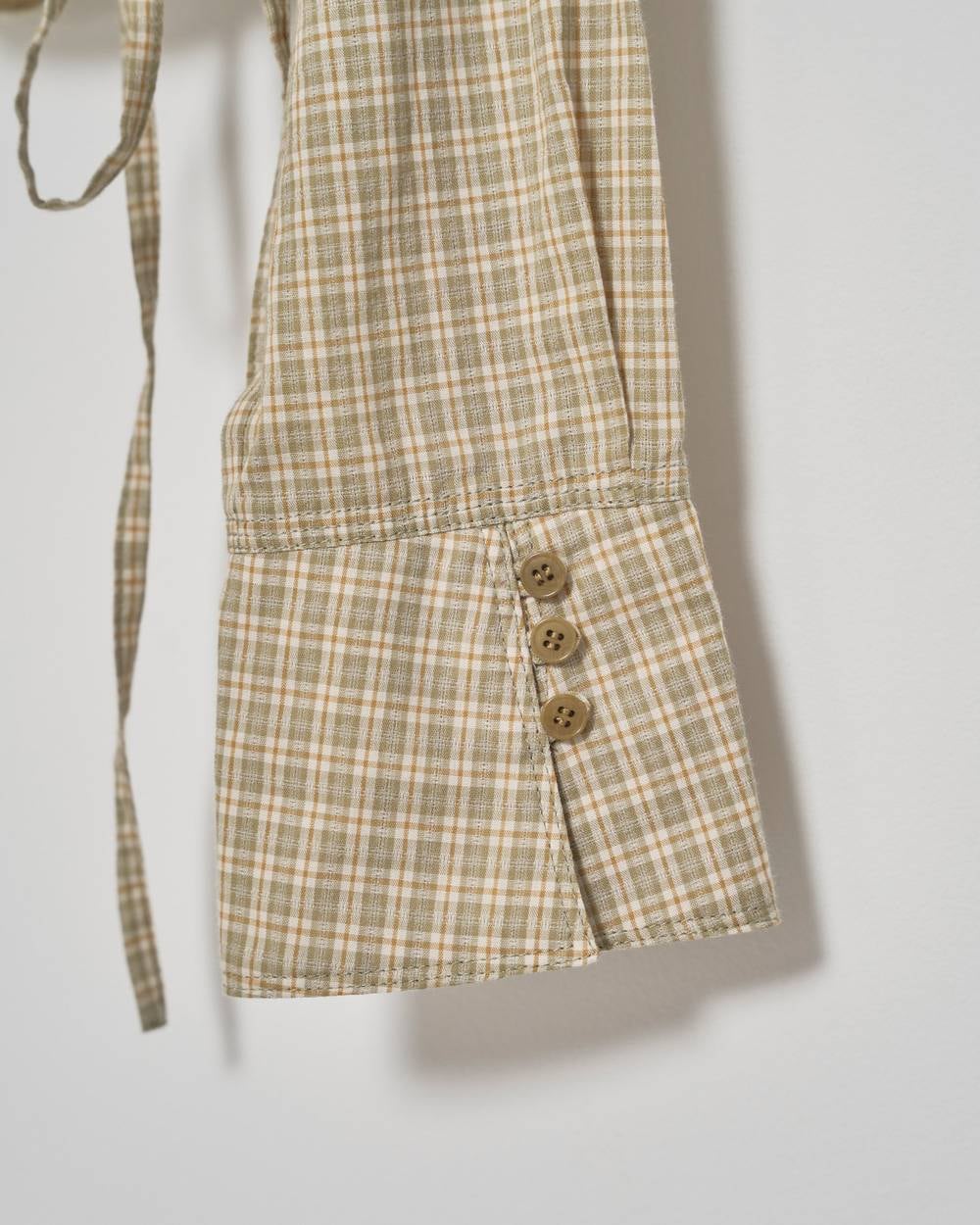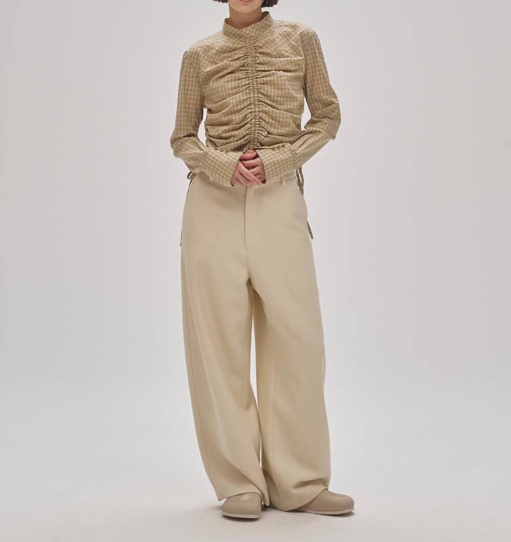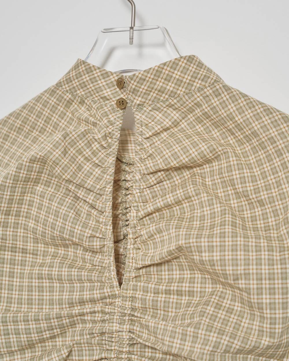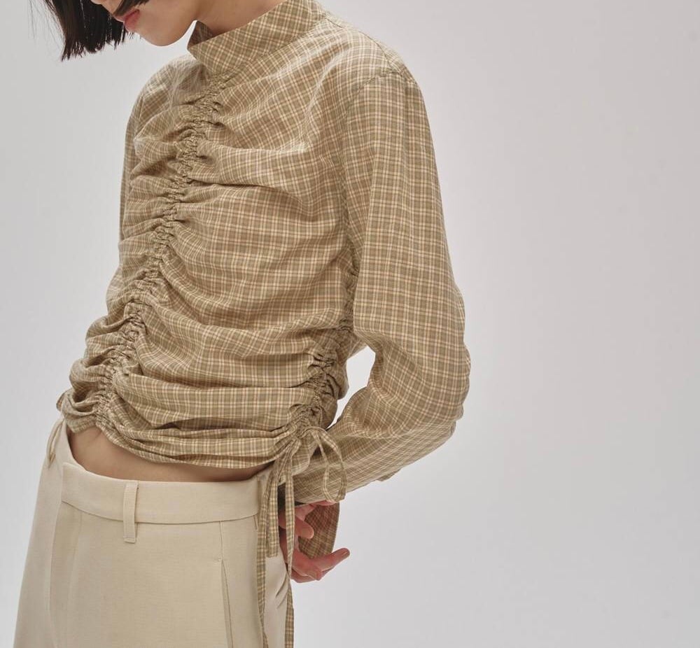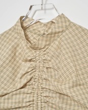 奥行きのあるチェック柄が目をひくブラウス。フロントとサイドに寄せたギャザーでふんわりとしたシルエットをつくり、コンパクトながら女性らしいバランスに仕上げました。シンプルなボトムスに合わせるだけで、華やかでこなれた印象に。