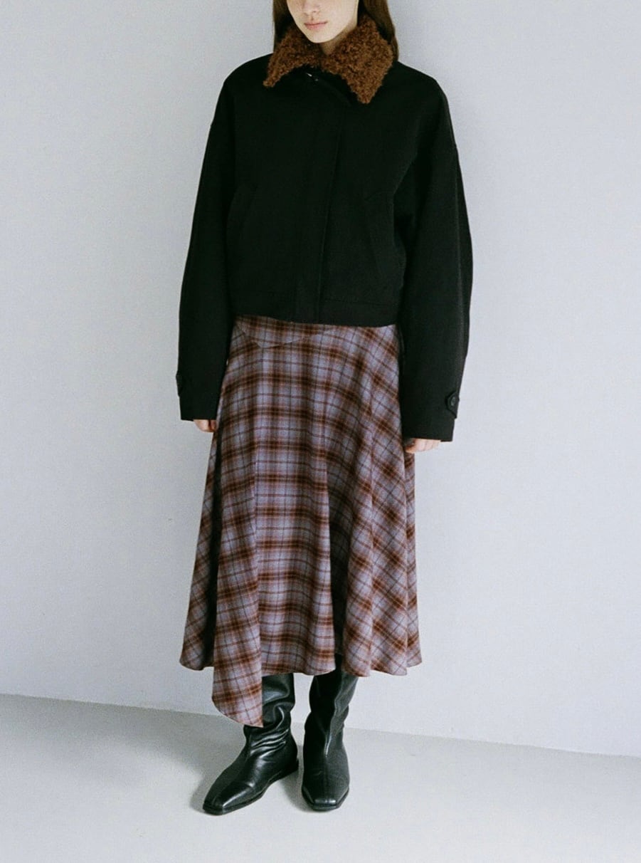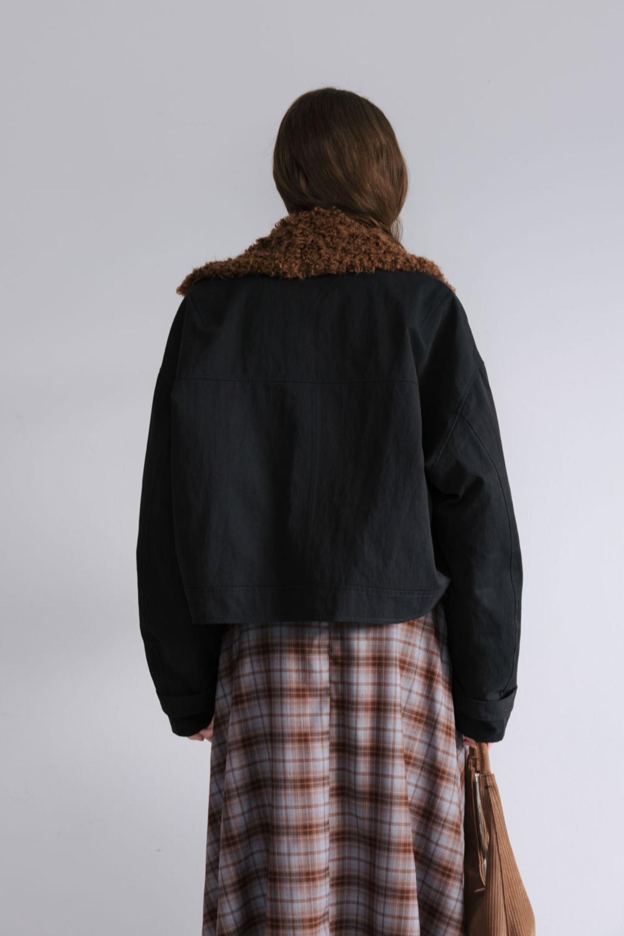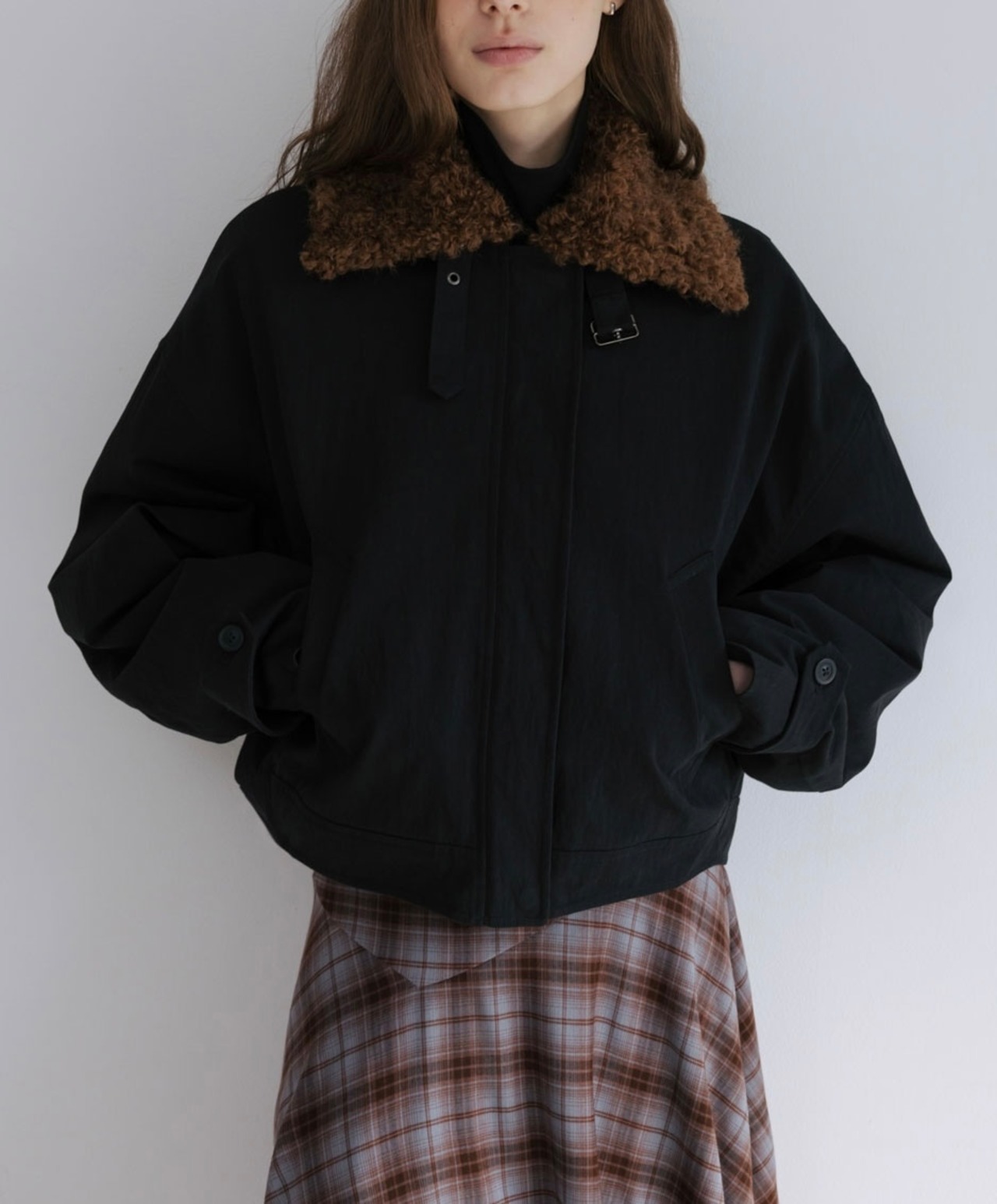 • ポケットあり。カールしたファーの襟がポイント。