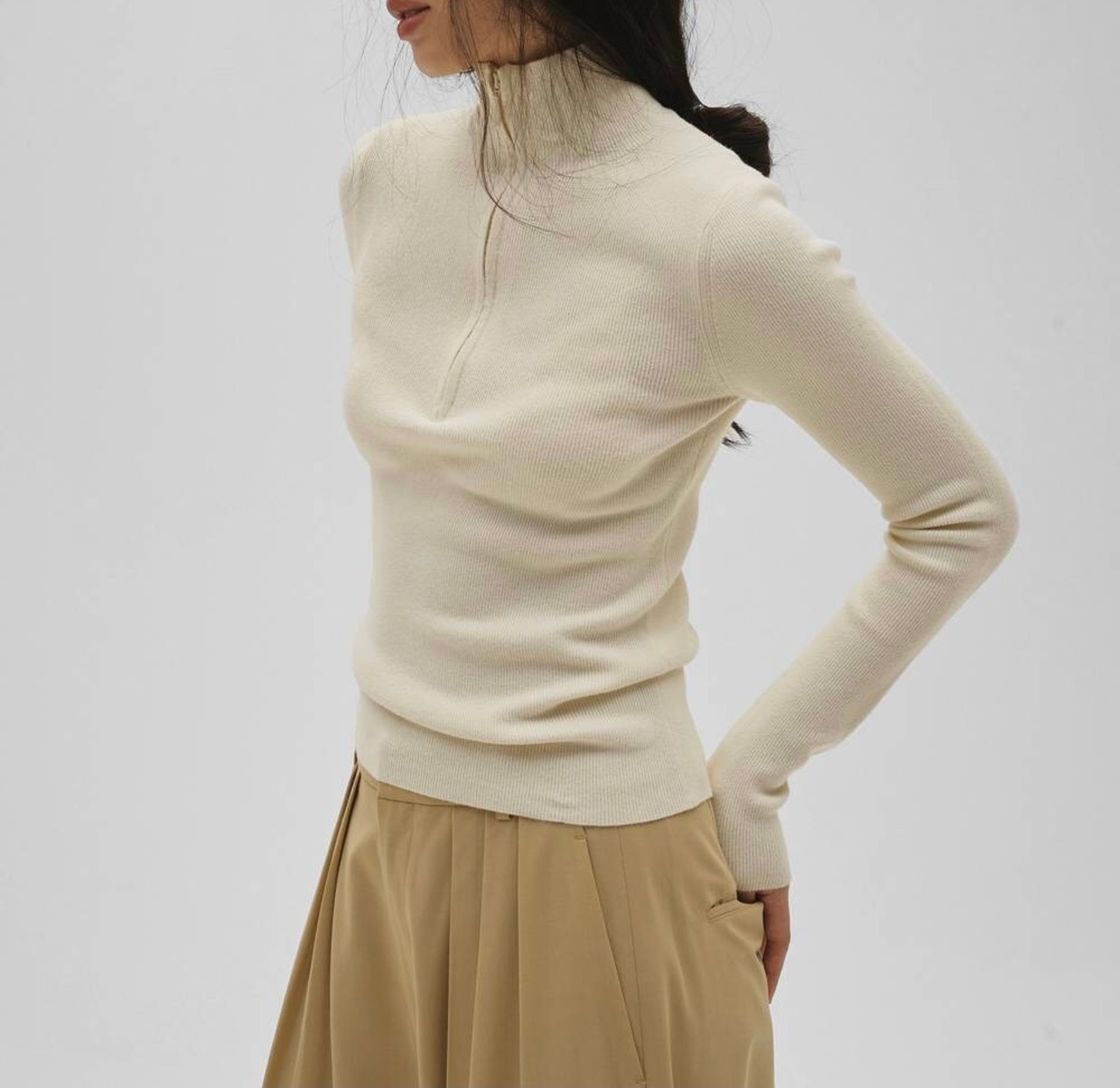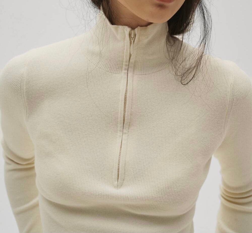 タイトなシルエットのジップニット。杢調のリブ編みで、ほどよい厚みとやわらかな肌触りが魅力。上品さとリラックス感を兼ね備えており、デイリーに着やすいです。合わせるアウターやボトムスを選ばず、幅広いスタイリングに活躍します。