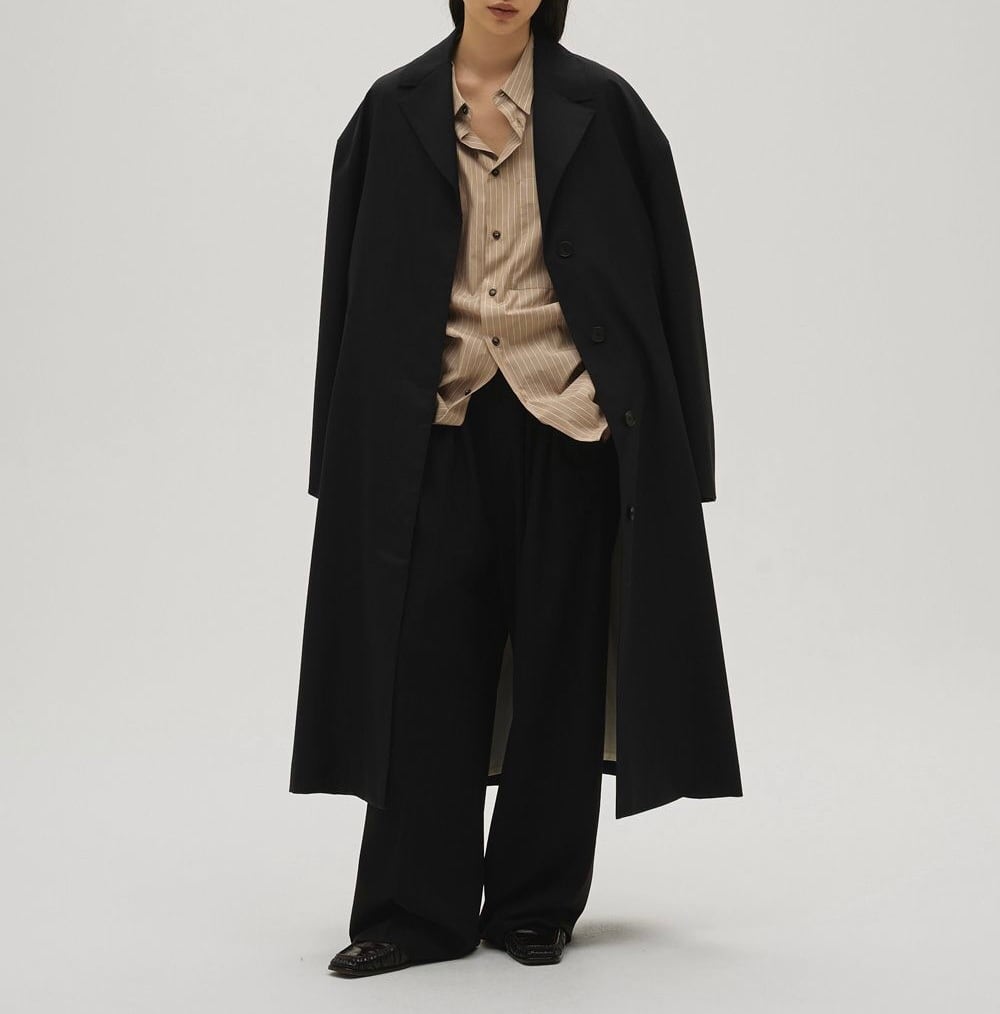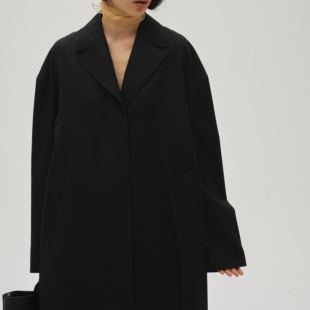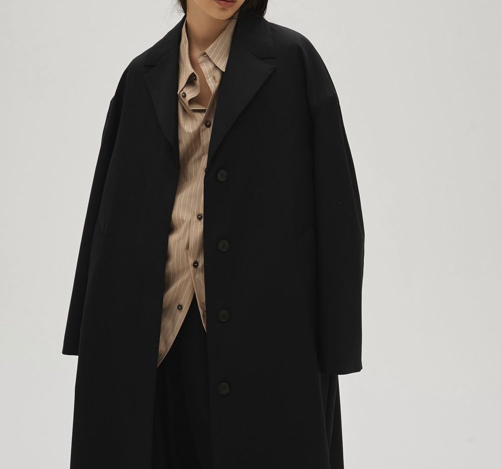 国内の上質なウール100%生地を使用したコート。細番手のウールを強く撚ることで生まれるしなやかさと、表情のあるシャンブレーカラーが魅力です。オーバーショルダーのシルエットに、コンパクトな襟を組み合わせてバランスよく仕上げました。羽織るだけでスタイリングを引き締め、幅広いシーンで活躍する一枚です。