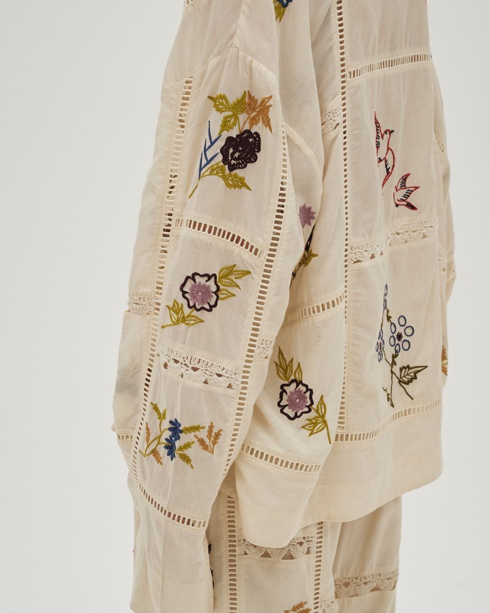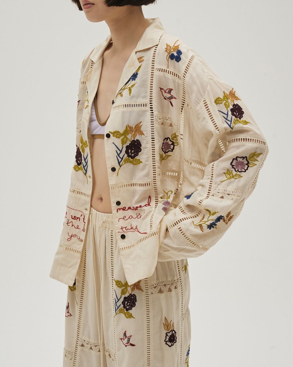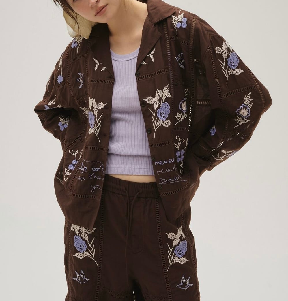 13種類もの刺繍をふんだんにあしらったパッチワークが目を惹く開襟シャツ。インドで一枚一枚に刺繍をあしらい、柄の配色や袖口のディテール等細部にまでこだわりの詰まったアイテム。シンプルなボトムスに合わせるだけでこなれた印象に。新色にバーガンディを追加しました。