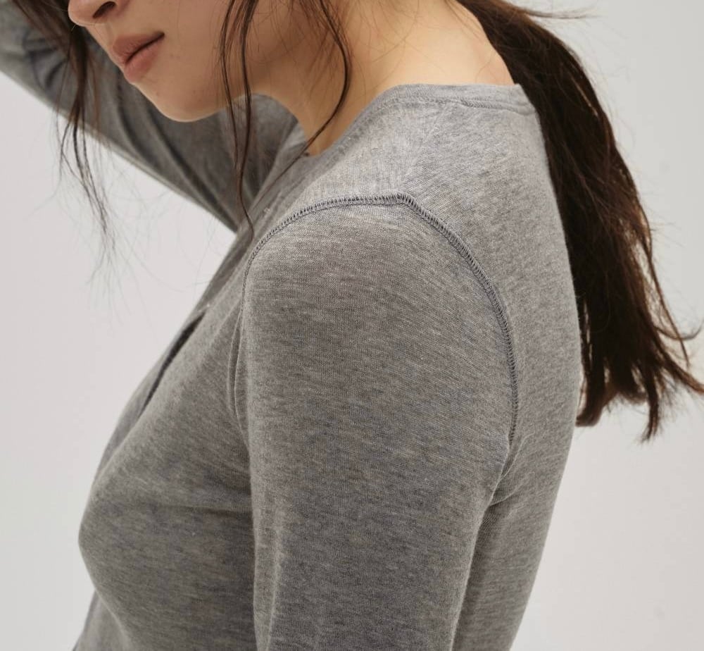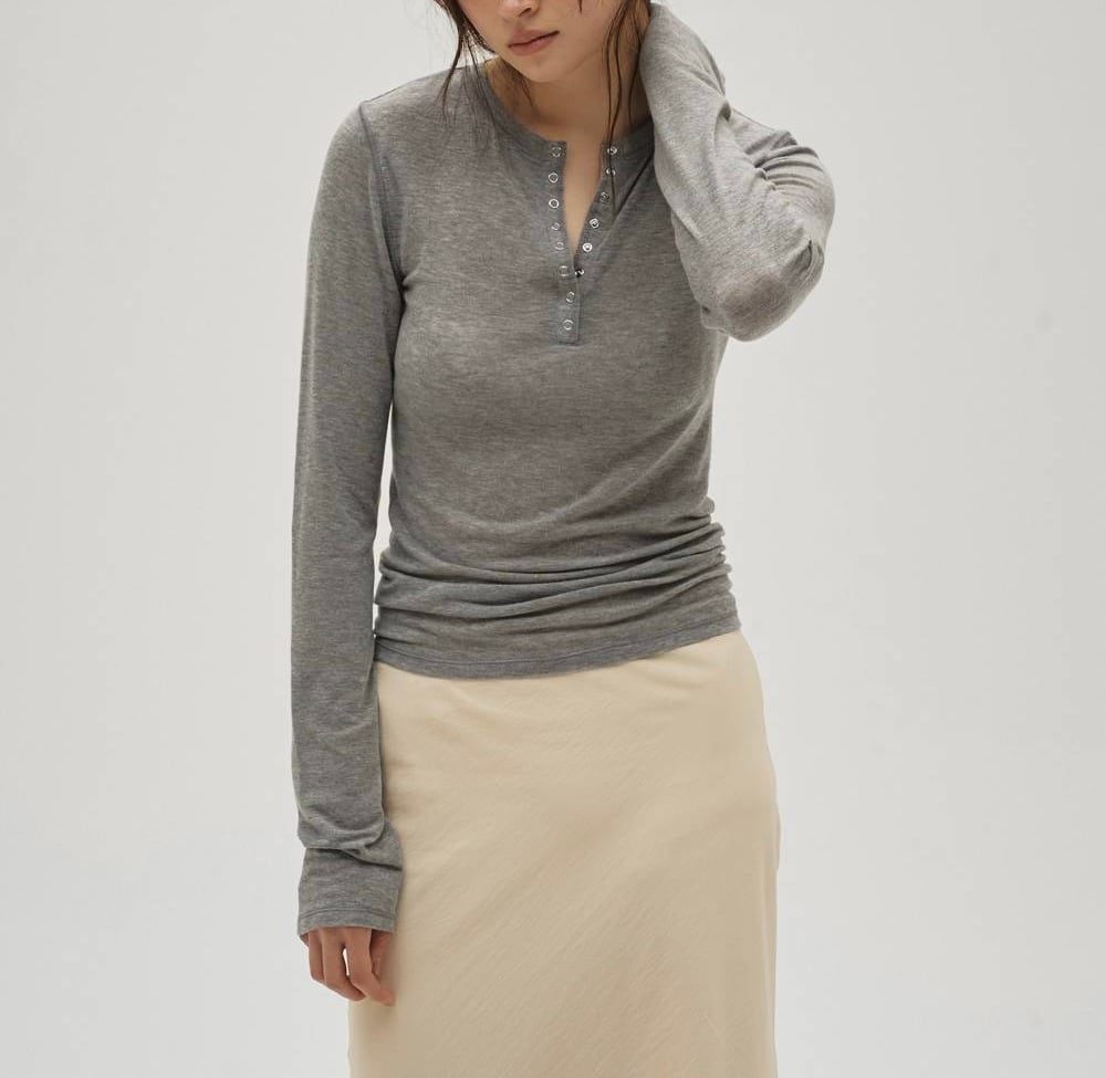 肌触りの良いふっくらとしたカットソー生地を使用したトップス。ヘンリーネックラインにあしらった華奢なリングドットボタンと、さりげなく効かせたステッチワークが魅力。身体に程良く沿うシルエットで、一枚でさらりと着るのはもちろん、色違いでのレイヤードやジャケットのインナーとしても活躍。ミニマルな中にニュアンスを感じさせるデザインで、様々なスタイルに自然と馴染むアイテムです。