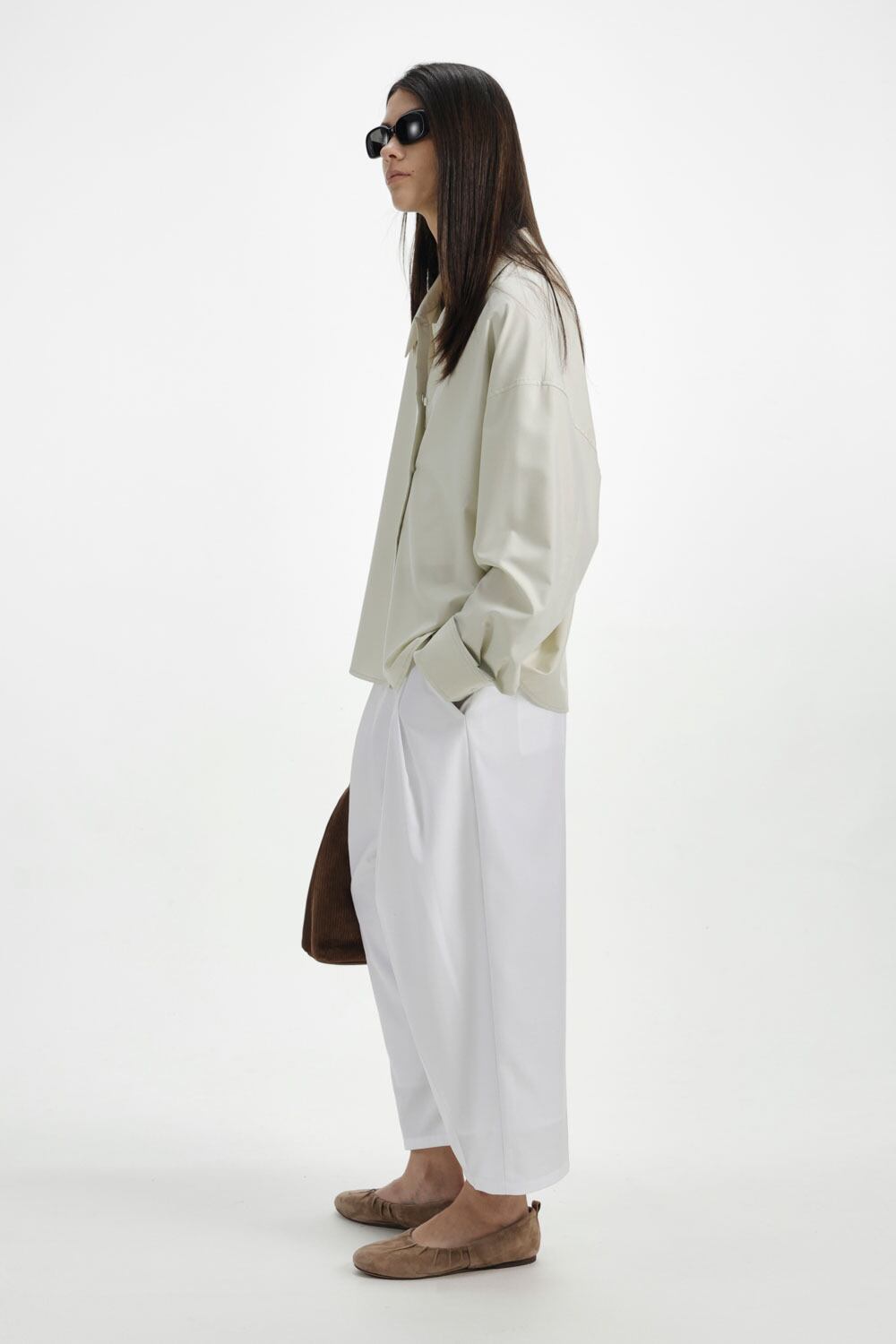 プリーツ加工を施したコクーンシルエットのクロップドパンツと好相性で、