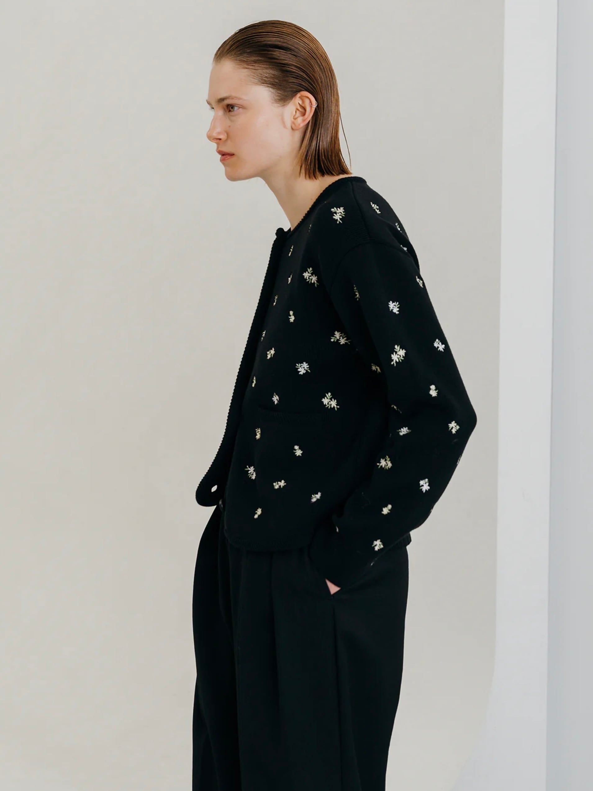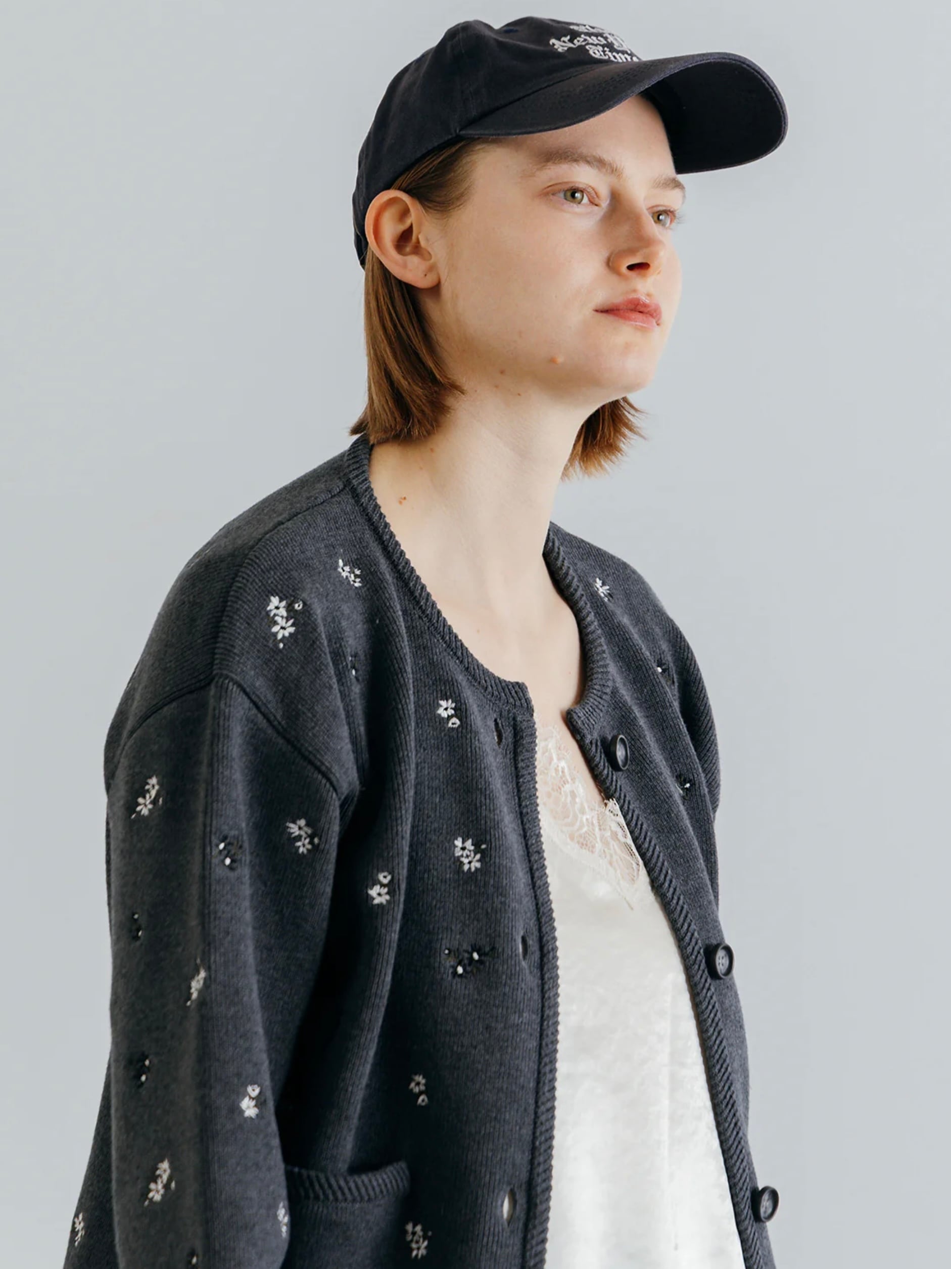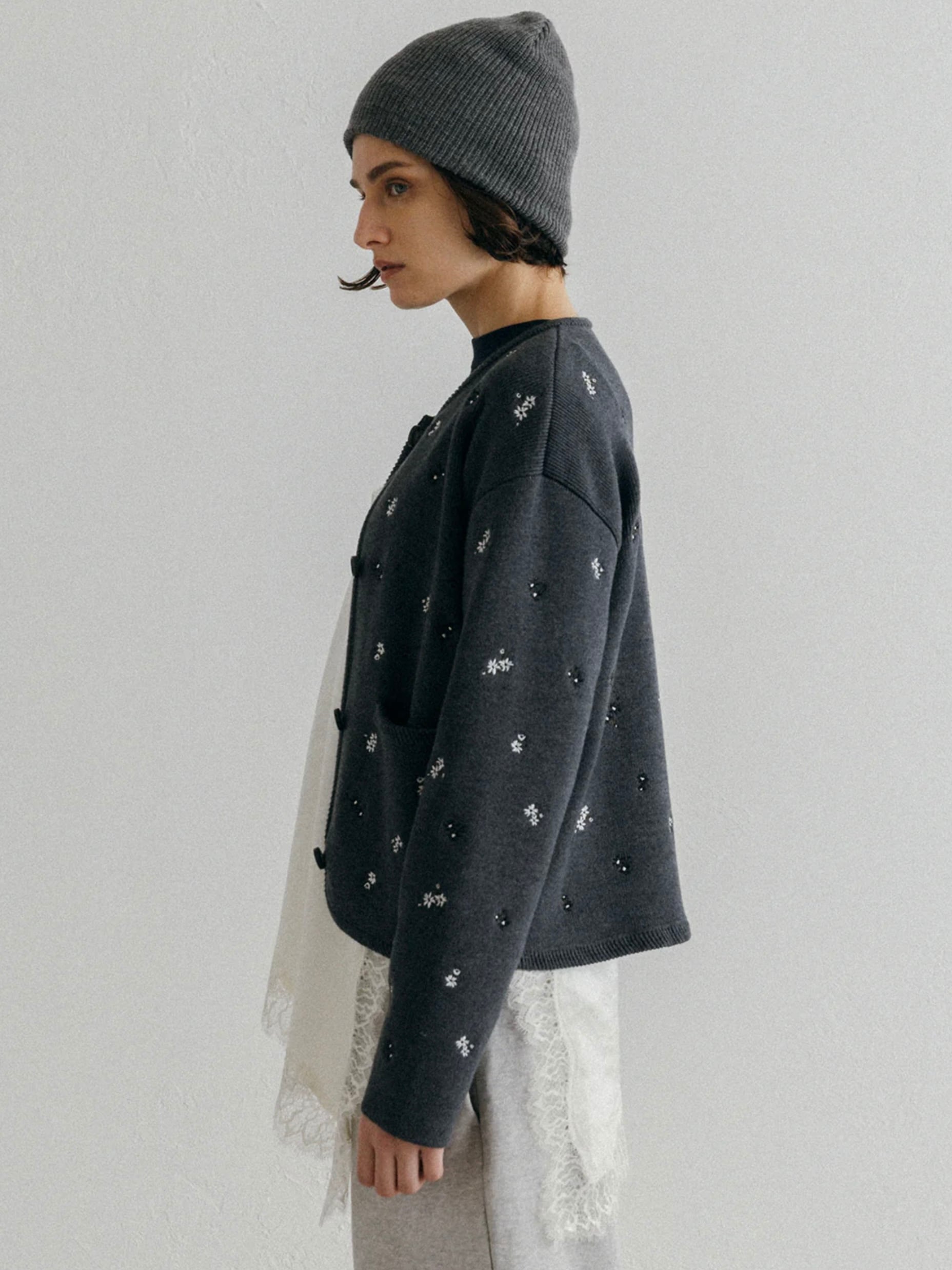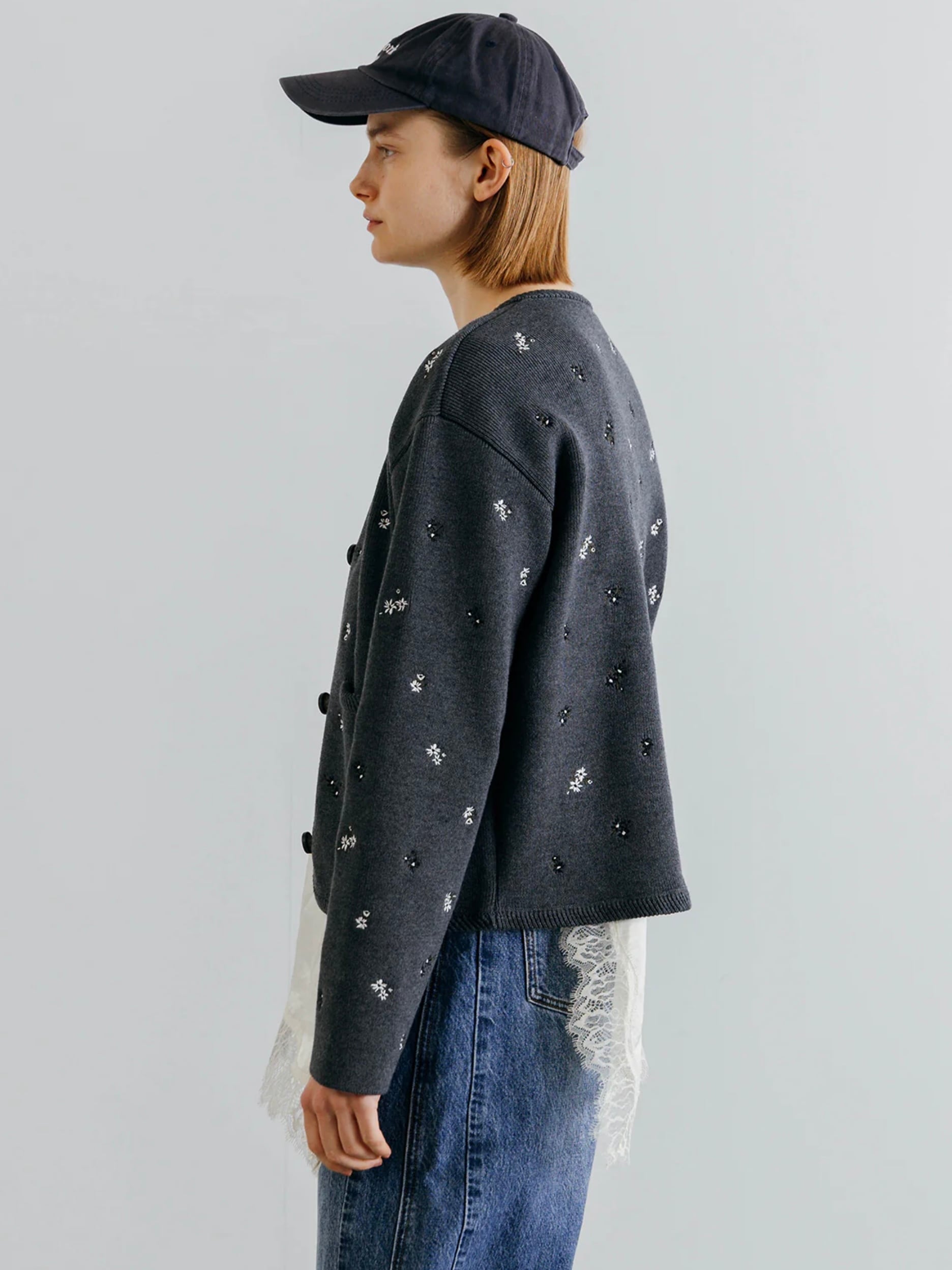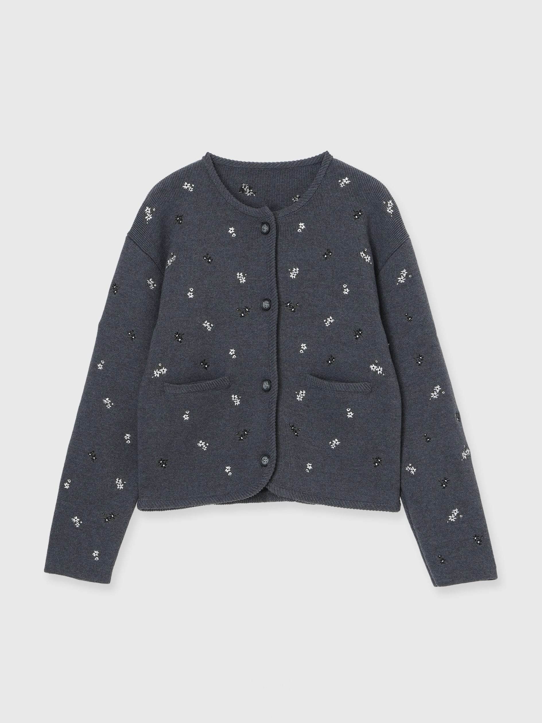 アーティスティックな小花の刺繍を散りばめ、羽織るだけで華やぎを添える一枚です。