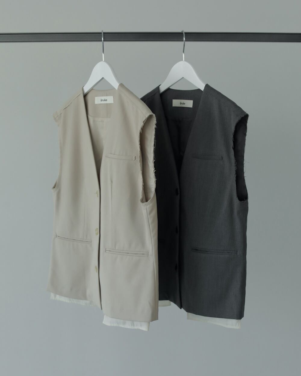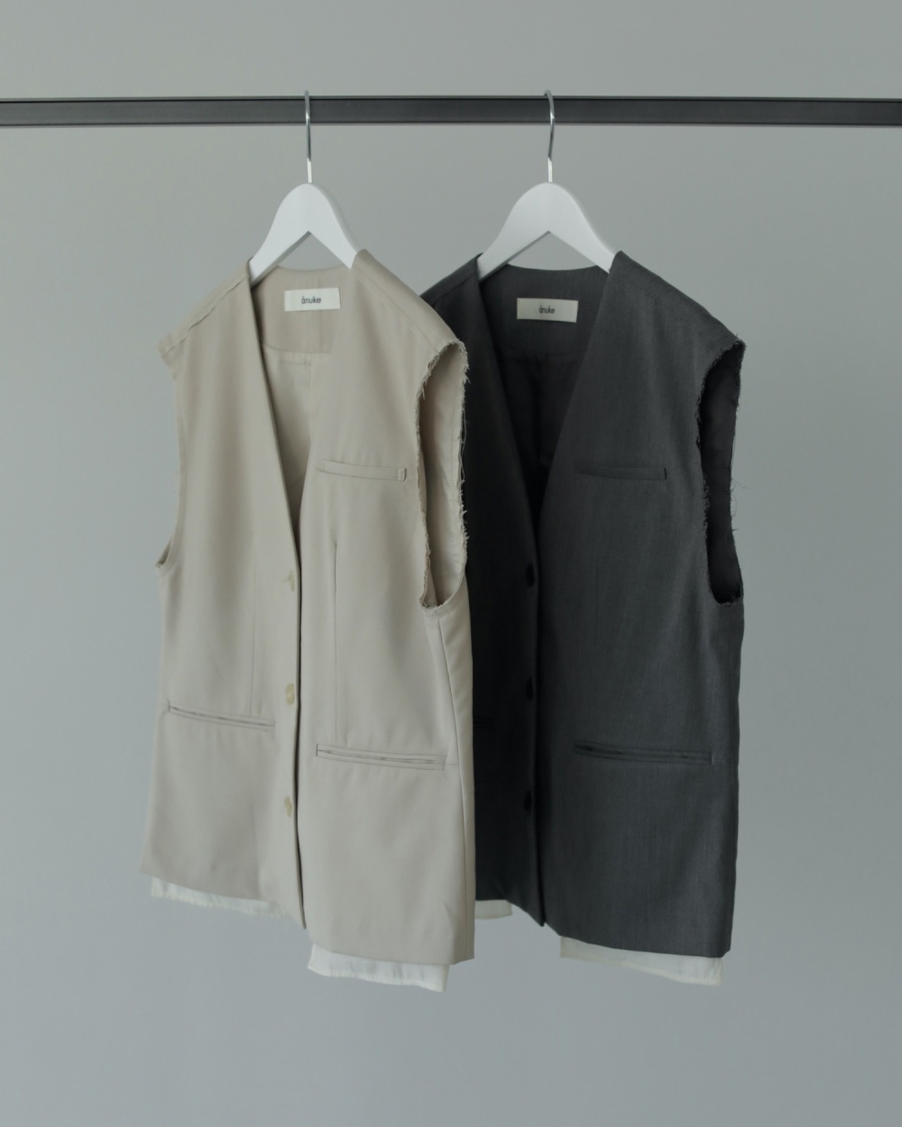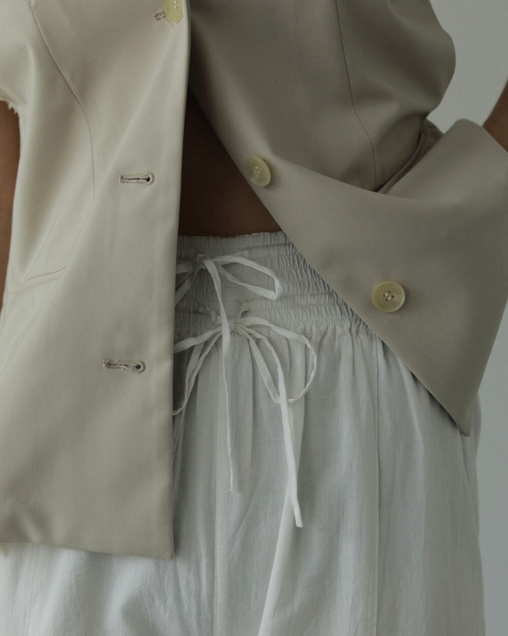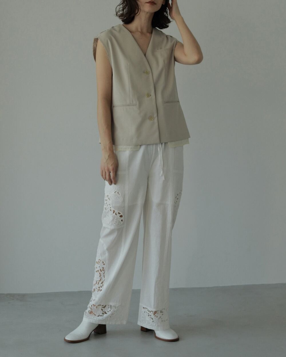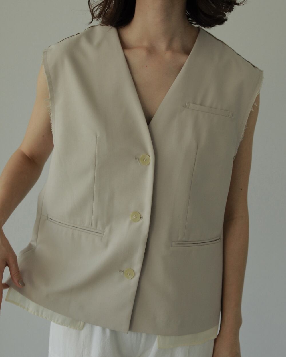 綺麗めに見えるツイル地を使用したベスト。同じシリーズのパンツ、スカートと合わせるのがおすすめです。ポケットをオーガンジーにして少し見える仕様にしたのがポイント。スタイリングのポイントになります。アームホールはカットオフにしています。