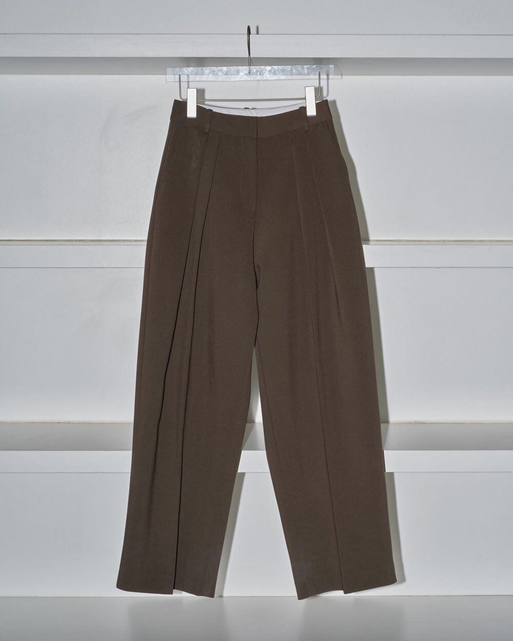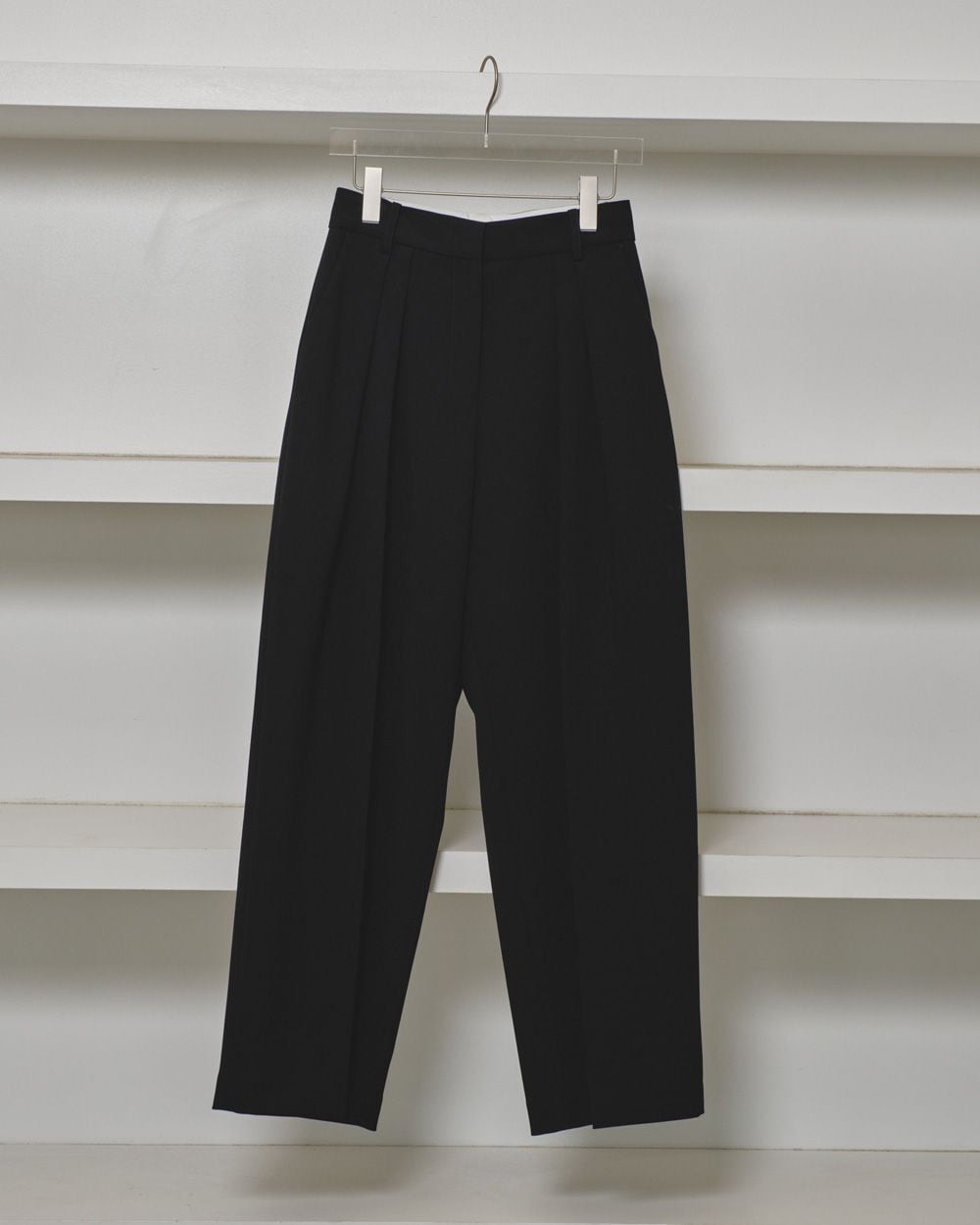 深めのダブルタックとワイドなシルエットが魅力のトラウザーズ。上質なツイル生地を使用し、内側に別生地をボンディング加工することで、シルエットをより立体的に見せてくれます。表地と同色のパイピングを挟んだオリジナルマーベルトとステッチを表に出さない仕立てがマニッシュでありながらも、どこか上品な印象に。新色として予約時にはなかったブラックを追加しました。