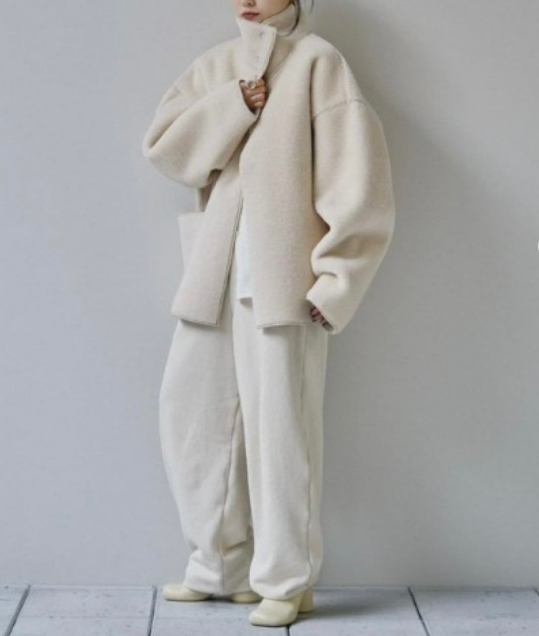 ワイドなボトムスと好相性。片方だけに付けた大きいポケットや、